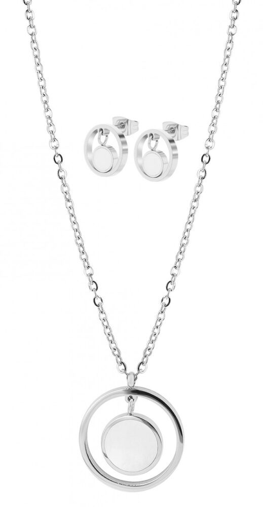 Fabricado em aço inoxidável robusto, este conjunto de jóias caracteriza-se não só pela sua durabilidade e facilidade de manutenção, mas também pelas suas propriedades hipoalergénicas, tornando-o a escolha ideal para o uso diário. A leveza do material garante um conforto de utilização agradável e uma qualidade duradoura. Fabricado em aço inoxidável de alta qualidade, o conjunto inclui um colar de 45 cm com um pendente e brincos a condizer. As peças de joalharia apresentam-se como círculos redondos sobre os quais um pequeno elemento redondo em madrepérola flutua e oscila elegantemente a cada movimento. O colar fecha-se com um fecho de lagosta e adorna o decote com um pendente redondo de 15 mm de diâmetro e 2 mm de espessura. Os brincos de pino a condizer destacam-se no orifício da orelha, com um diâmetro de 10 mm e uma espessura de 2 mm.