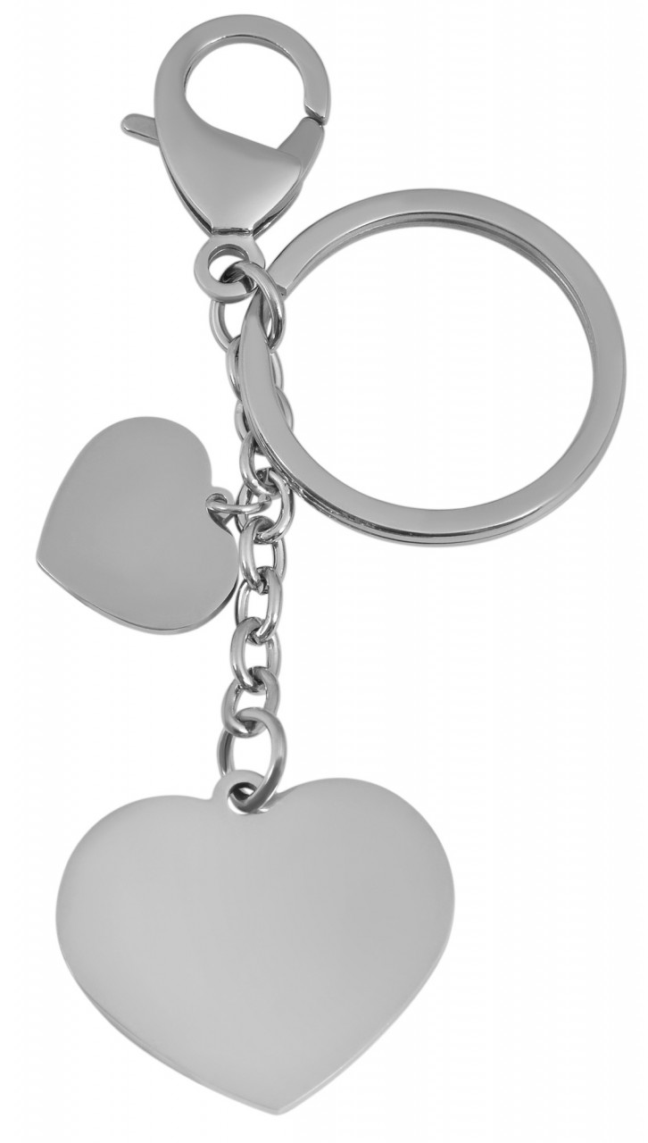 O chaveiro da marca Accent é feito de aço inoxidável. O pingente tem a forma de um coração e um segundo pingente em forma de coração está preso aos ilhós de aço inoxidável. É perfeito como presente personalizado, pois o pingente é uma placa de gravação altamente polida medindo 26 mm de comprimento, 30 mm de largura e 2 mm de espessura. O segundo pingente menor tem comprimento de 15 mm, largura de 19 mm e espessura de 1 mm. O pingente pode ser gravado em ambos os lados e é muito robusto porque é feito de aço inoxidável. O pingente é preso a um chaveiro com oito ilhós de aço inoxidável. Tem um diâmetro de 30 mm e também é feito de aço inoxidável e é muito robusto. Este chaveiro é um lindo acessório que valoriza qualquer chaveiro.