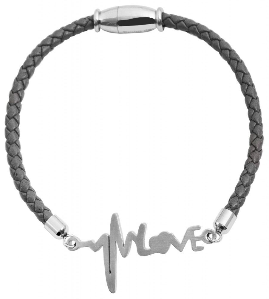 A pulseira em pele genuína da marca Akzent é composta por uma bracelete em pele entrançada, decorada com um elemento em aço inoxidável prateado no centro. Este representa uma curva de batimento cardíaco e as letras L – O – V – E, que estão ligadas entre si para criar um símbolo significativo. A pulseira de jóias especiais pode ser aberta e fechada com um prático fecho magnético. Mede 17 cm de comprimento, 1,8 cm de largura e 3 mm de espessura. Uma peça de joalharia com significado que constitui um excelente presente.