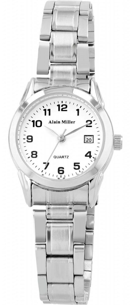 O relógio analógico de 3 ponteiros para mulher de Alain Miller – uma obra-prima de design intemporal e o seu companheiro diário perfeito. O comprimento total do relógio é de 20 cm, mas pode ser ajustado ao comprimento desejado graças aos elementos removíveis. A caixa de metal mede 27 mm de diâmetro e tem uma altura confortável de 9 mm. A pulseira de elos de aço inoxidável tem uma largura de 14 mm nas alças e pode ser aberta e fechada usando um fecho dobrável de aço inoxidável. O fundo da caixa é feito de aço inoxidável, o que aumenta a longevidade do relógio. O robusto vidro mineral protege o mostrador, que possui algarismos arábicos, garantindo um display claro e de fácil leitura. Este relógio feminino está equipado com um movimento preciso de quartzo SL28. Outro detalhe deste relógio feminino é que ele está equipado com um display de data.
