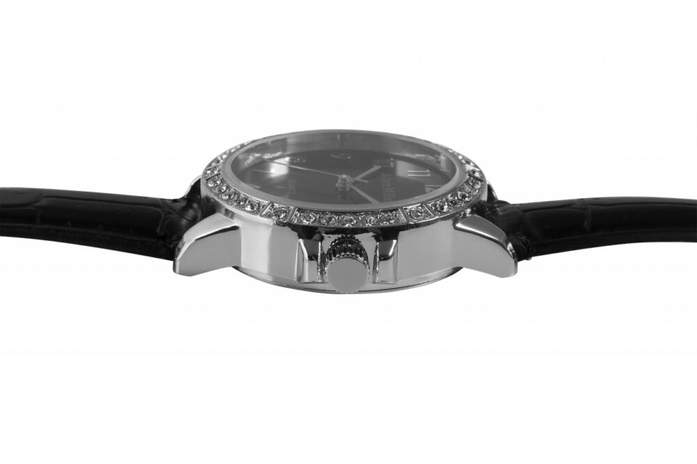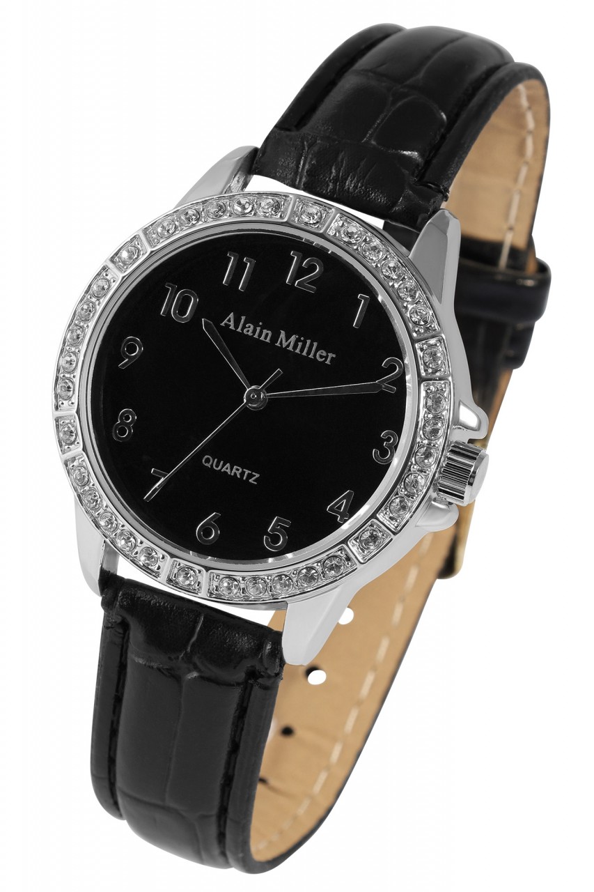 Um relógio de senhora que nenhuma senhora moderna e elegante de hoje deve perder! Alain Miller faz tudo bem com este relógio de senhora com bracelete em imitação de pele com aspeto de pele de crocodilo. A bracelete estreita (1,5 cm) favorece qualquer pulso e é elegante e simples em preto com um ligeiro acolchoamento para um elevado conforto de utilização e um comprimento total de 22,2 cm. O destaque absoluto do relógio é, sem dúvida, a bela caixa em aço inoxidável com um diâmetro de 3,5 cm e uma altura de 1 cm numa versão dourada ou prateada, cada uma com 36 Simili, que não só facilitam a leitura deste relógio com a sua divisão ao longo dos algarismos árabes que adornam o mostrador, como também o transformam numa verdadeira peça de joalharia com o seu brilho intenso. O elegante relógio de senhora é fechado com uma fivela de aço inoxidável de alta qualidade.