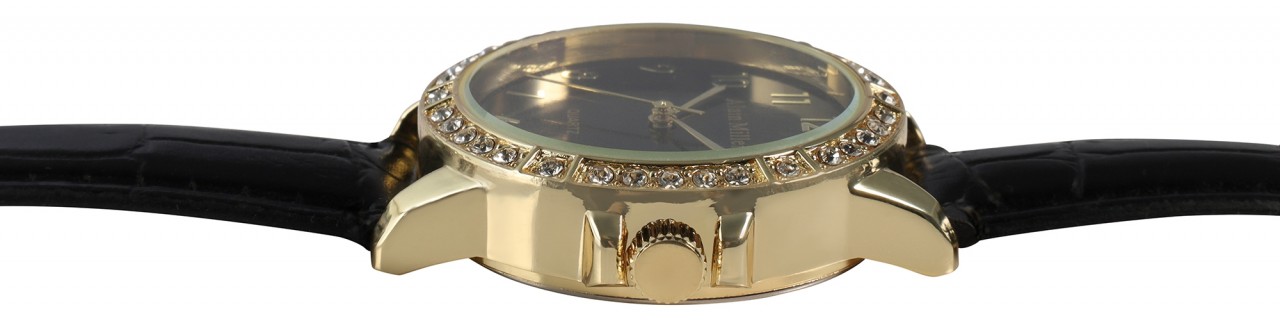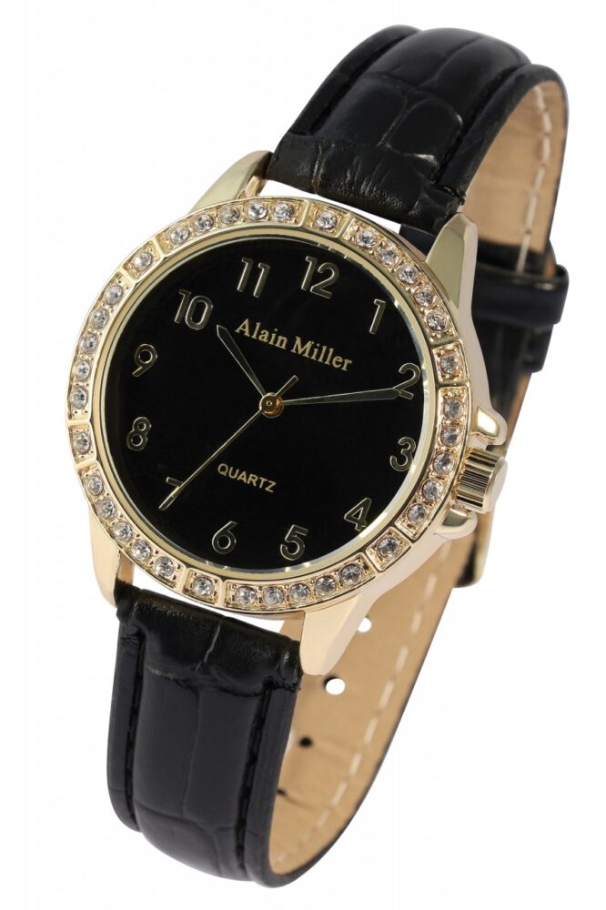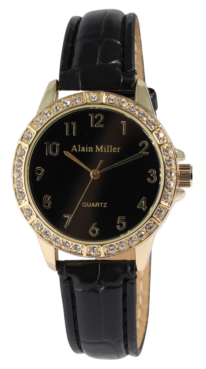 Um relógio de senhora que nenhuma senhora moderna e elegante de hoje deve perder! Alain Miller faz tudo bem com este relógio de senhora com bracelete em imitação de pele com aspeto de pele de crocodilo. A bracelete estreita (1,5 cm) favorece qualquer pulso e é elegante e simples em preto com um ligeiro acolchoamento para um elevado conforto de utilização e um comprimento total de 22,2 cm. O destaque absoluto do relógio é, sem dúvida, a bela caixa em aço inoxidável com um diâmetro de 3,5 cm e uma altura de 1 cm, em design dourado ou prateado, cada uma com 36 simili, que não só facilitam a leitura deste relógio com a sua divisão ao longo dos algarismos…