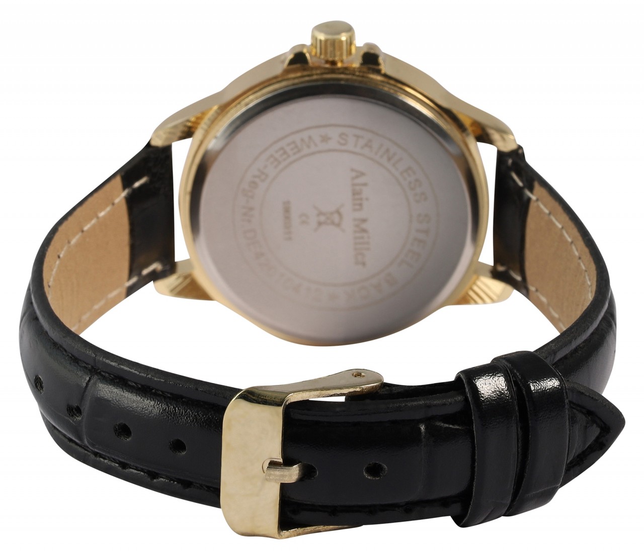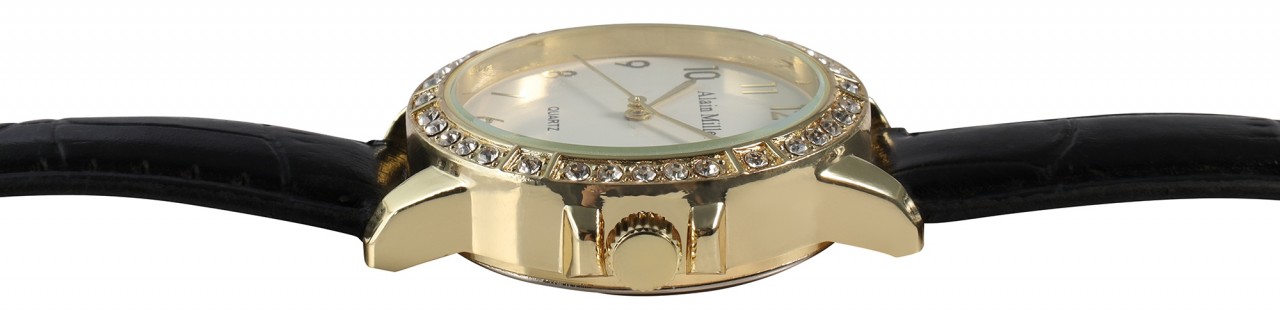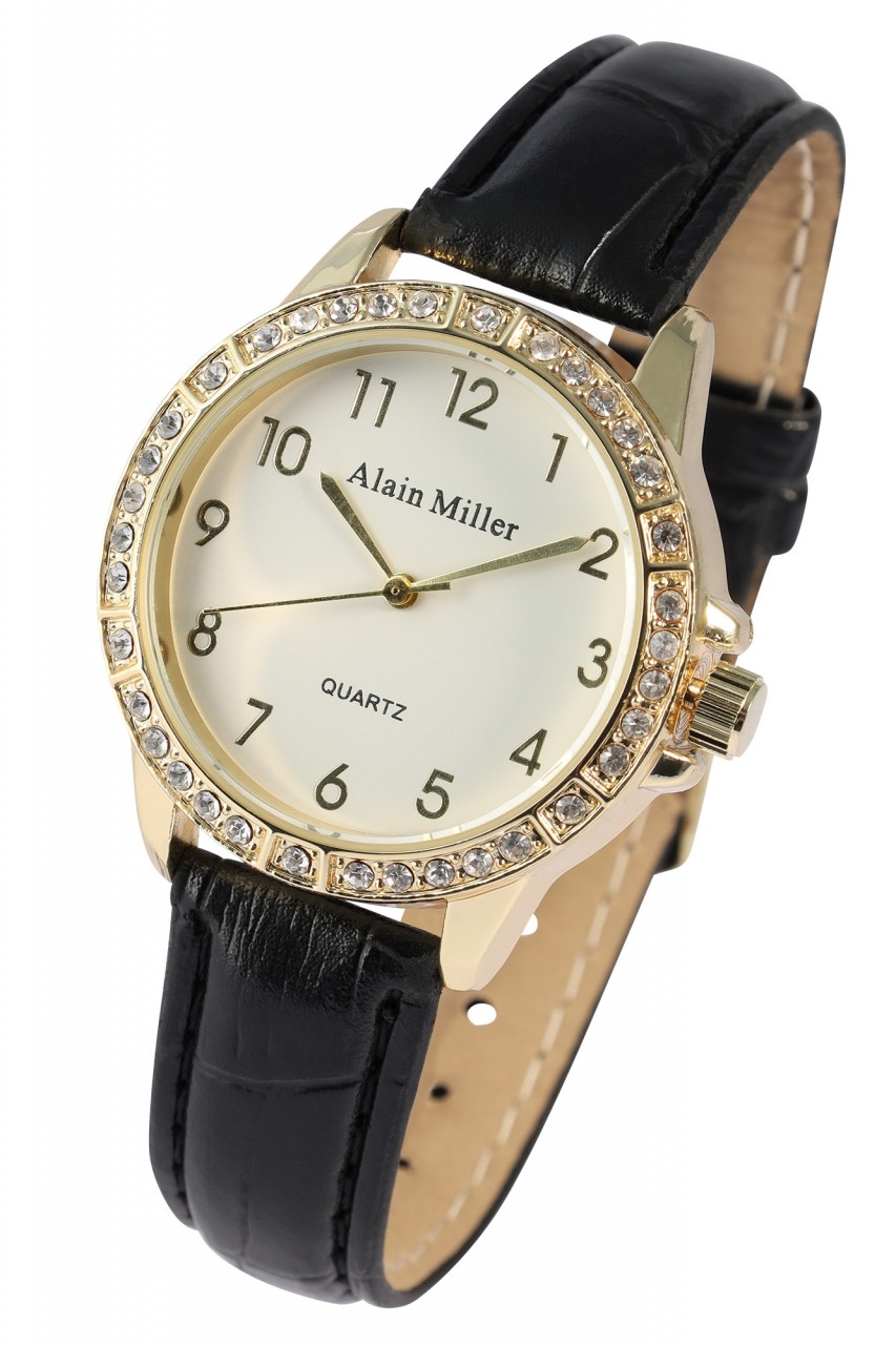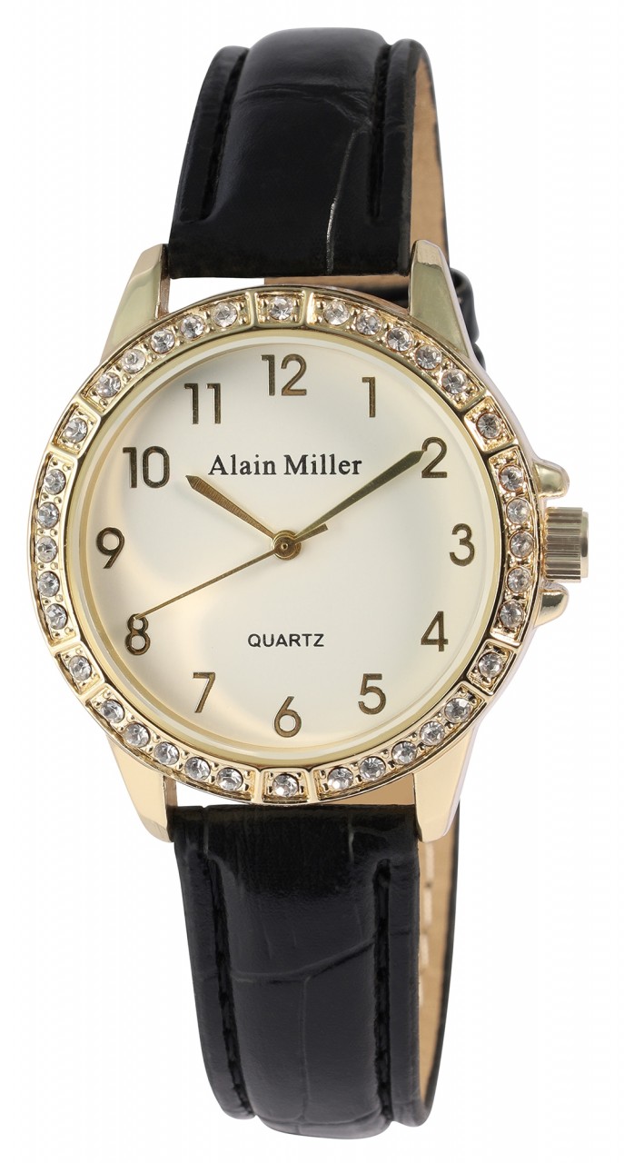 Um relógio de senhora que nenhuma senhora moderna e elegante de hoje deve perder! Alain Miller faz tudo bem com este relógio de senhora com bracelete em imitação de pele com aspeto de pele de crocodilo. A bracelete estreita (1,5 cm) favorece qualquer pulso e é elegante e simples em preto com um ligeiro acolchoamento para um elevado conforto de utilização e um comprimento total de 22,2 cm. O destaque absoluto do relógio é, sem dúvida, a bela caixa em aço inoxidável com um diâmetro de 3,5 cm e uma altura de 1 cm, em design dourado ou prateado, cada uma com 36 simili, que não só facilitam a leitura deste relógio com a sua divisão ao longo dos algarismos…