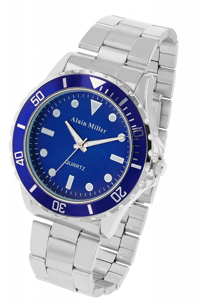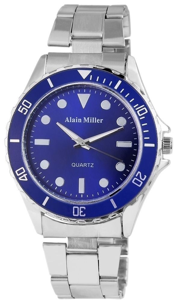 O relógio de pulso analógico de 3 ponteiros para homem da marca Alain Miller possui um movimento de quartzo de alta qualidade. A bracelete em aço inoxidável tem 20 mm de largura na extremidade e pode ser aberta e fechada com um fecho desdobrável em aço inoxidável. O comprimento total do relógio é de 21,5 cm. A caixa metálica com vidro mineral tem um diâmetro de 44 mm e uma altura de 11 mm. O fundo da caixa é feito de aço inoxidável. Os ponteiros revestidos a Superluminova, os índices de linhas e de pontos facilitam a leitura das horas mesmo no escuro. O peso leve do relógio torna-o confortável de usar.