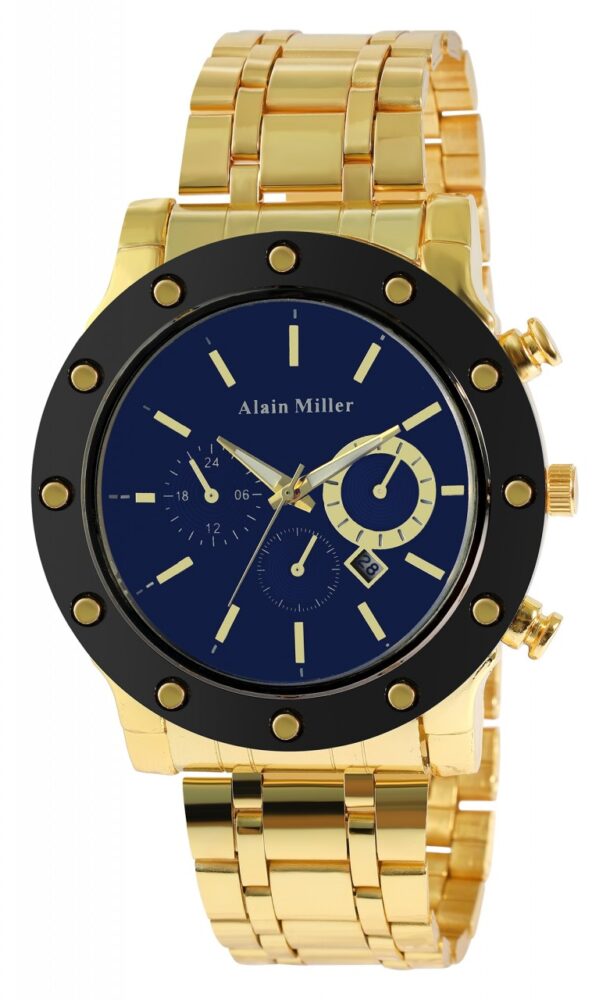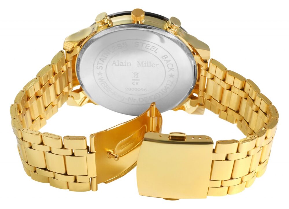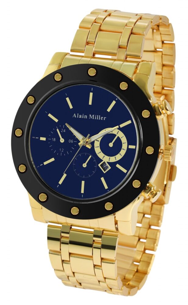 O relógio de pulso masculino analógico de 3 ponteiros com visual crono da marca Alain Miller possui um movimento de quartzo de alta qualidade. A pulseira em aço inoxidável tem 24 mm de largura nas alças e pode ser aberta e fechada através de um fecho dobrável em aço inoxidável. O comprimento total do relógio é de 23,5 cm. A caixa de metal com vidro mineral tem um diâmetro de 49 mm e uma altura de 12 mm. O fundo da caixa é feito de aço inoxidável. Graças aos ponteiros revestidos com superluminova, as horas podem ser lidas mesmo no escuro. Este relógio está disponível em diferentes versões de cores, por isso existe o relógio certo para cada roupa.