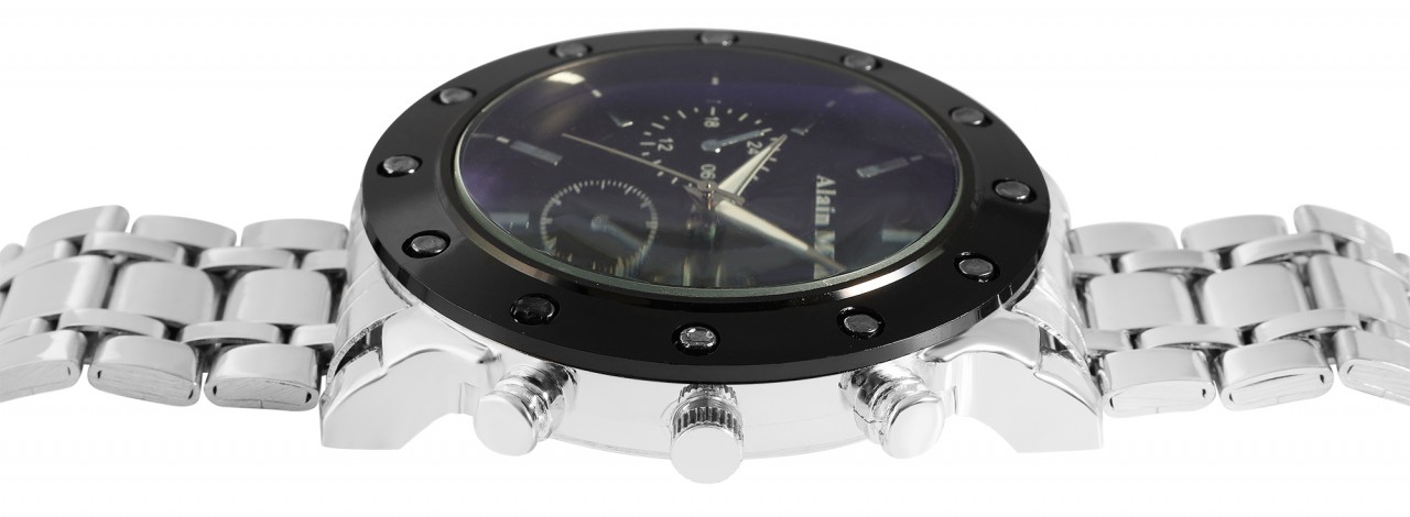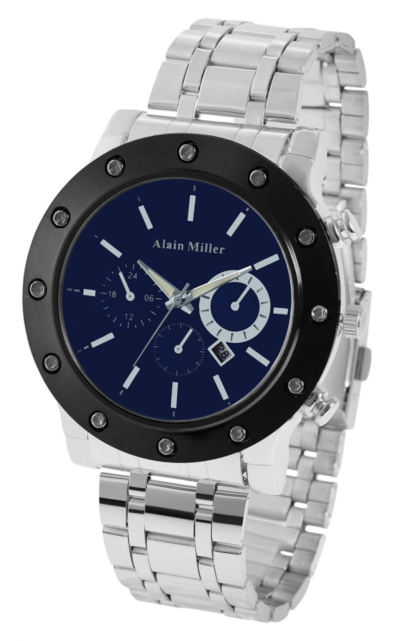 O relógio de pulso masculino analógico de 3 ponteiros com visual crono da marca Alain Miller possui um movimento de quartzo de alta qualidade. A pulseira em aço inoxidável tem 24 mm de largura nas alças e pode ser aberta e fechada através de um fecho dobrável em aço inoxidável. O comprimento total do relógio é de 23,5 cm. A caixa de metal com vidro mineral tem um diâmetro de 49 mm e uma altura de 12 mm. O fundo da caixa é feito de aço inoxidável. Graças aos ponteiros revestidos com superluminova, as horas podem ser lidas mesmo no escuro. Este relógio está disponível em diferentes versões de cores, por isso existe o relógio certo para cada roupa.