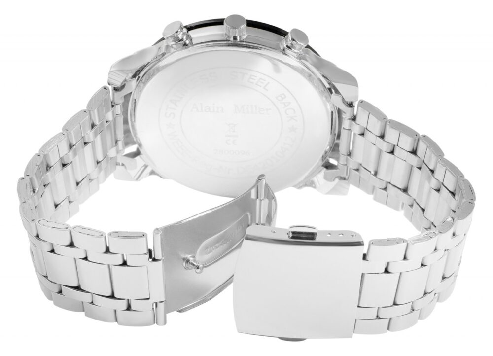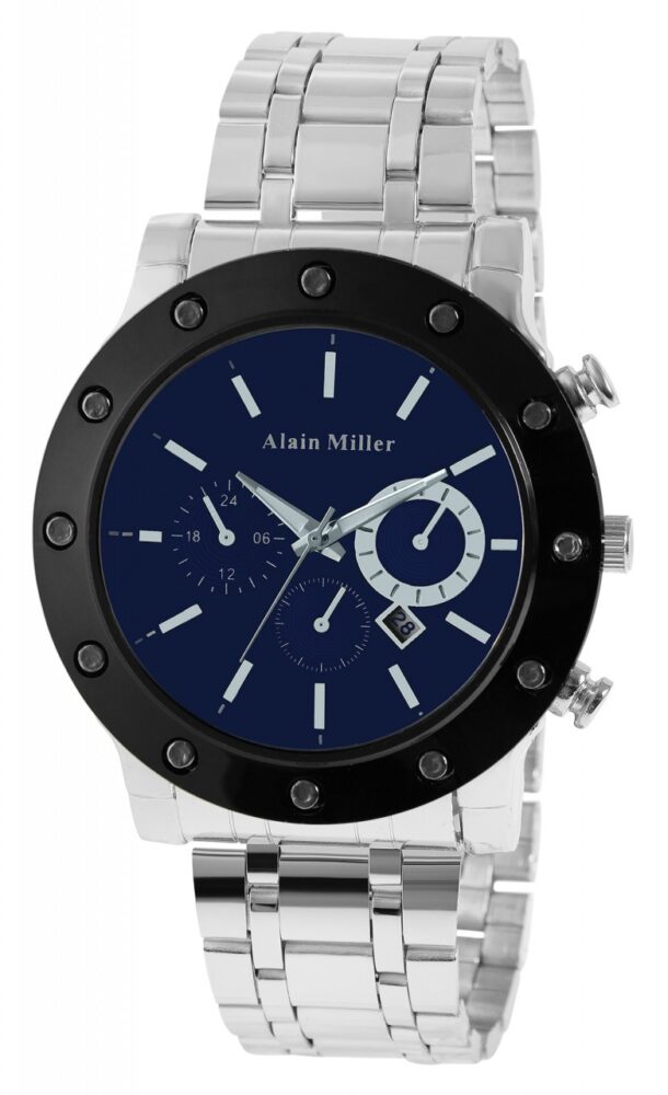 O relógio de pulso masculino analógico de 3 ponteiros com visual crono da marca Alain Miller possui um movimento de quartzo de alta qualidade. A pulseira em aço inoxidável tem 24 mm de largura nas alças e pode ser aberta e fechada através de um fecho dobrável em aço inoxidável. O comprimento total do relógio é de 23,5 cm. A caixa de metal com vidro mineral tem um diâmetro de 49 mm e uma altura de 12 mm. O fundo da caixa é feito de aço inoxidável. Graças aos ponteiros revestidos com superluminova, as horas podem ser lidas mesmo no escuro. Este relógio está disponível em diferentes versões de cores, por isso existe o relógio certo para cada roupa.