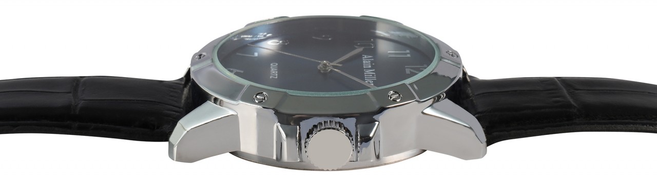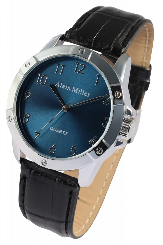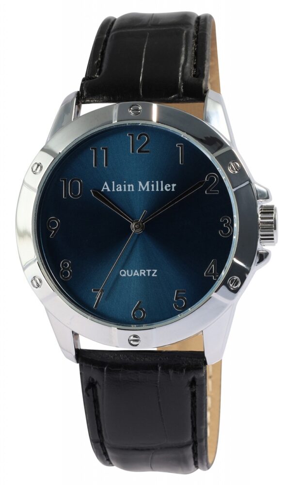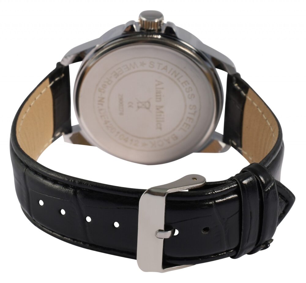 Um relógio de homem Alain Miller na moda, com uma bracelete em imitação de pele com aspeto de pele de crocodilo, esta peça de joalharia para negócios e lazer não deve faltar no guarda-roupa de qualquer homem! A bracelete larga deste relógio (2,2 cm) favorece o pulso de qualquer homem e é elegante e simples em preto, com um ligeiro acolchoamento para um elevado conforto de utilização e um comprimento total de 23,9 cm. O destaque absoluto do relógio é sem dúvida a bela caixa em aço inoxidável com um diâmetro de 4,2 cm e uma altura de 1,2 cm num acabamento dourado ou prateado. O corpo do relógio torna-se especial pelo seu mostrador de fácil leitura em diferentes cores, com algarismos árabes e uma útil divisão em 6 secções de tempo no bordo da caixa. Este relógio de homem intemporal e moderno é fechado com uma fivela de aço inoxidável de alta qualidade.