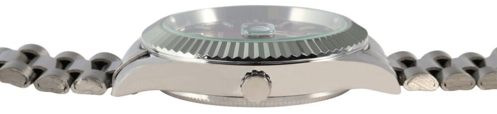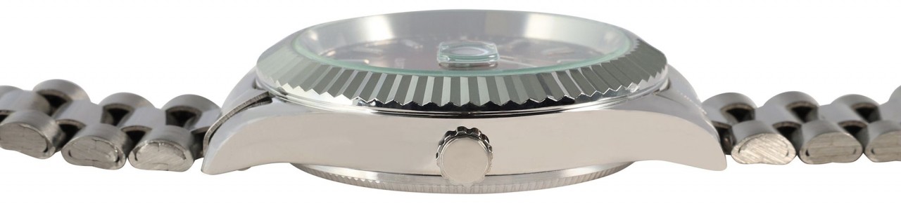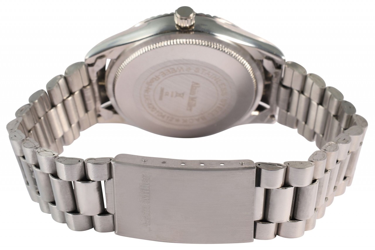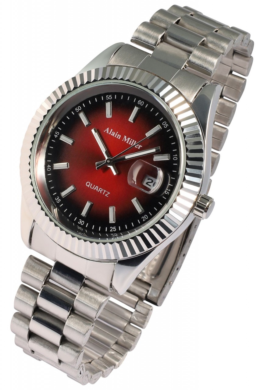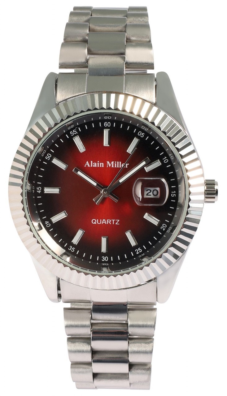 Este elegante relógio de pulso para homem Alain Miller, com design de 3 ponteiros e indicação da data, equipado com uma bracelete de elos, é fabricado em aço inoxidável robusto e assenta firmemente no pulso graças ao fecho desdobrável. Com um diâmetro de caixa de 4 cm, a caixa tem um bom tamanho, que parece discreto e que, no entanto, graças ao rebordo canelado, cria um atrativo habilidoso que não escapará definitivamente à atenção dos seus observadores. O mostrador, com algarismos árabes e um índice de barras para facilitar a legibilidade, dá um toque colorido em contraste com a caixa e a bracelete prateadas do relógio, que varia consoante a versão, mas é sempre especial, pois os algarismos árabes e o índice de barras refletem-se no rebordo polido do relógio sob o vidro mineral e criam visualmente um espaço tridimensional que sugere profundidade. Um relógio de homem de grande sucesso para qualquer ocasião, que com uma largura de bracelete de 2 cm e um comprimento total de 24 cm assenta bem na maioria dos pulsos.