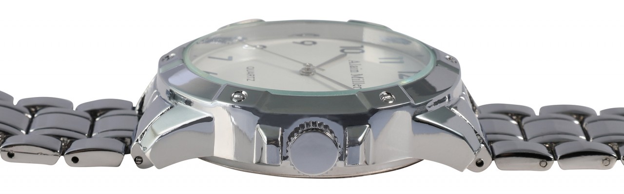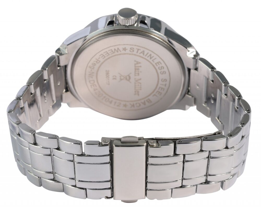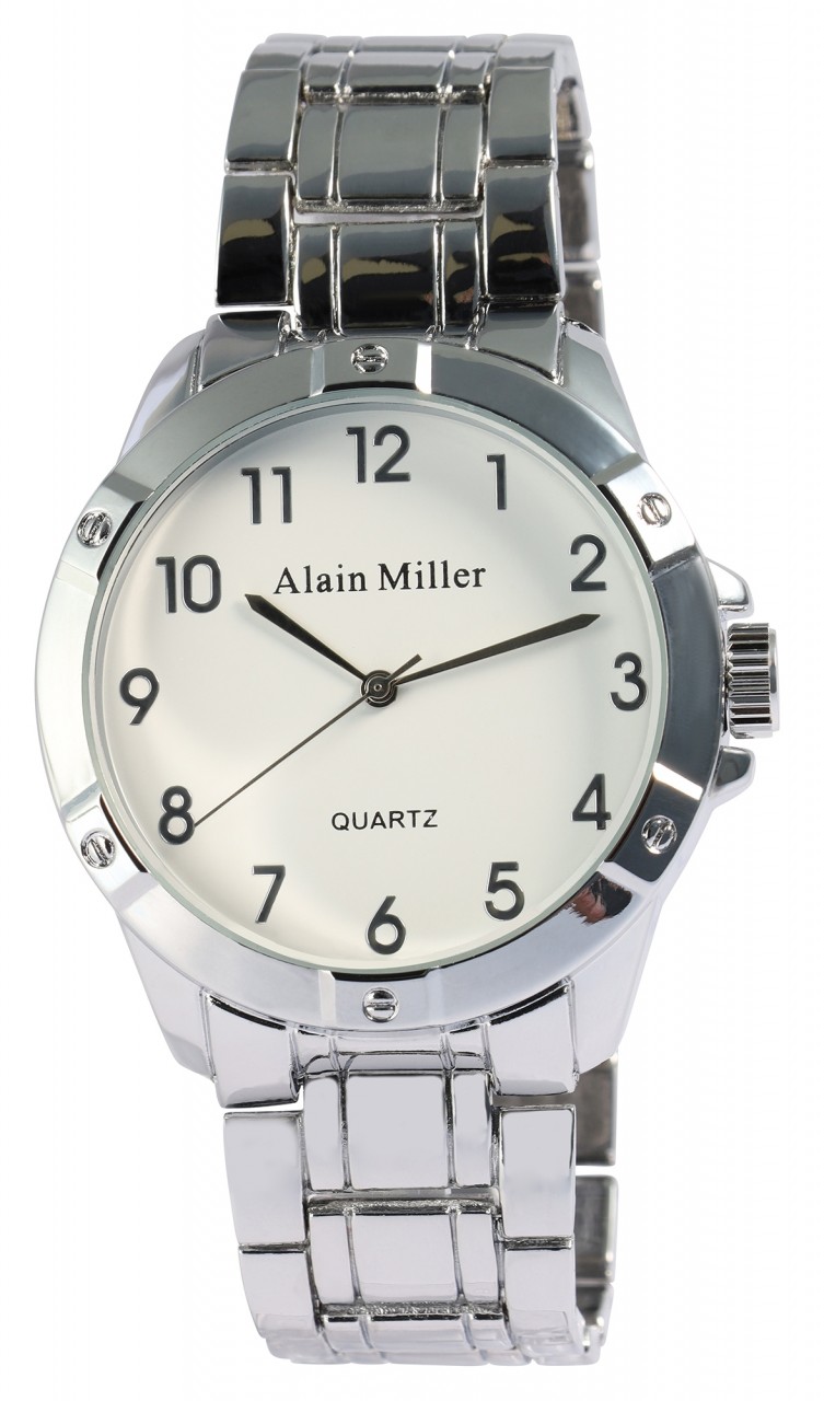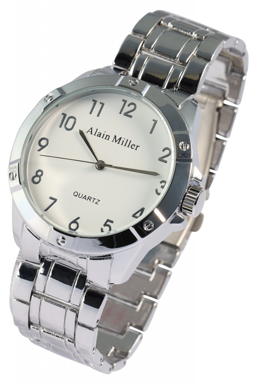 Este relógio de homem Alain Miller é uma verdadeira peça de joalharia para a vida profissional e de lazer e não pode faltar no guarda-roupa de qualquer homem! A bracelete larga em metal prateado (2 cm) favorece o pulso de qualquer homem e é simples e resistente graças aos grandes elos móveis e ao fecho dobrável. O comprimento total do relógio quando fechado é de 22 cm. O destaque absoluto do relógio é, sem dúvida, a robusta e pesada caixa em aço inoxidável com um diâmetro de 4,2 cm e uma altura de 1,1 cm, que é arredondada nos bordos exteriores para se ajustar perfeitamente ao pulso. O corpo do relógio torna-se especial pelo seu mostrador de fácil leitura em diferentes cores, com algarismos árabes e uma útil divisão em 6 secções de tempo no bordo da caixa.