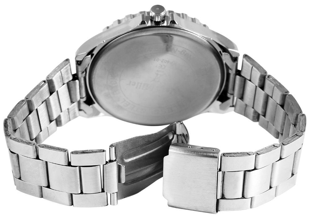 O relógio de pulso analógico masculino de 3 ponteiros de Alain Miller possui um movimento de quartzo de alta qualidade. A pulseira de aço inoxidável tem 20 mm de largura na alça e pode ser aberta e fechada usando um fecho dobrável de aço inoxidável. O comprimento total do relógio é de 21,5 cm. A caixa de metal com vidro mineral tem um diâmetro de 44 mm e uma altura de 11 mm. O fundo da caixa é feito de aço inoxidável. Os ponteiros, índices de linhas e pontos revestidos com Superluminova facilitam a leitura das horas, mesmo no escuro. Devido ao seu peso leve, o relógio é confortável de usar.