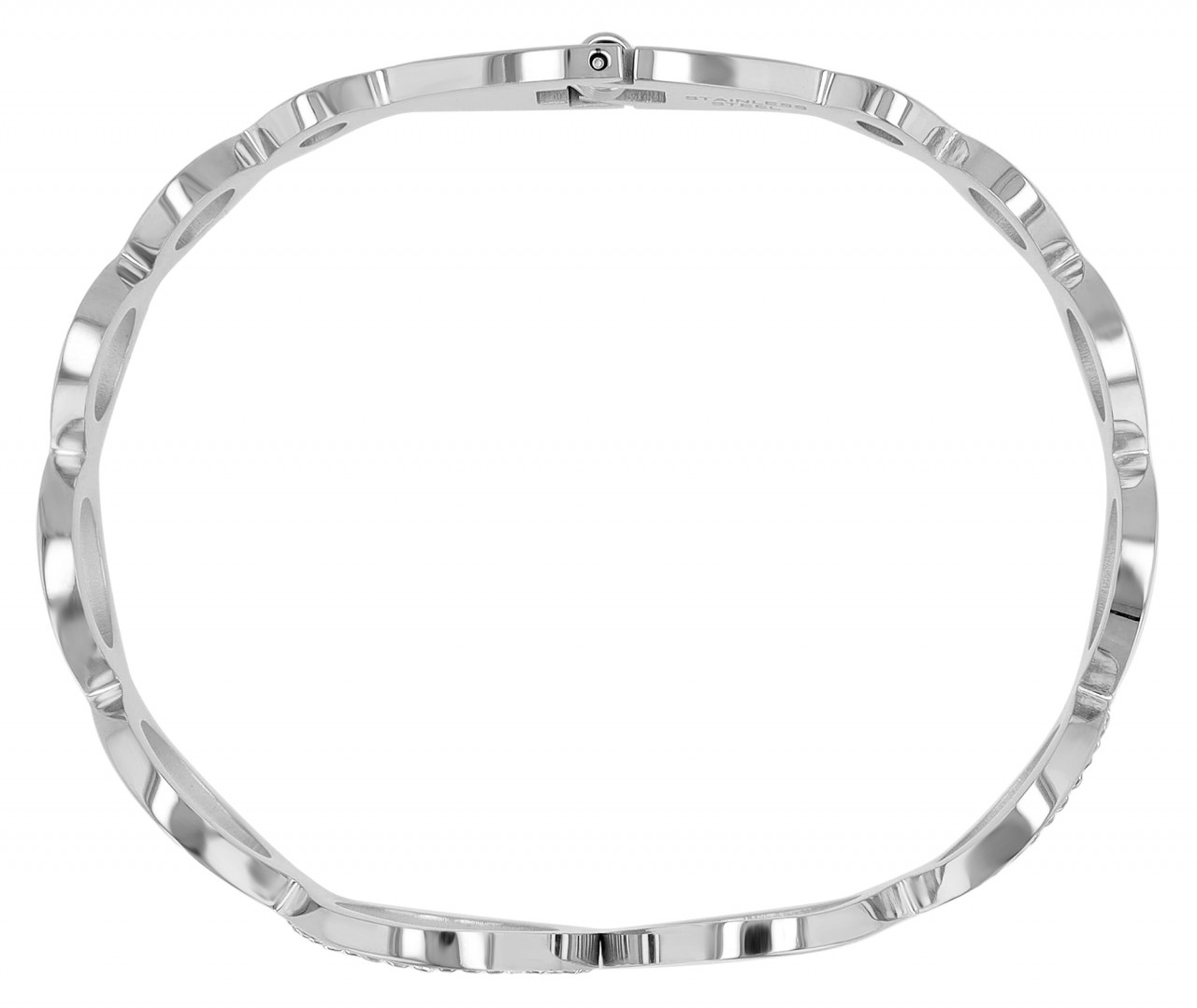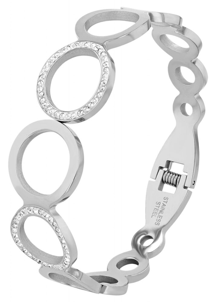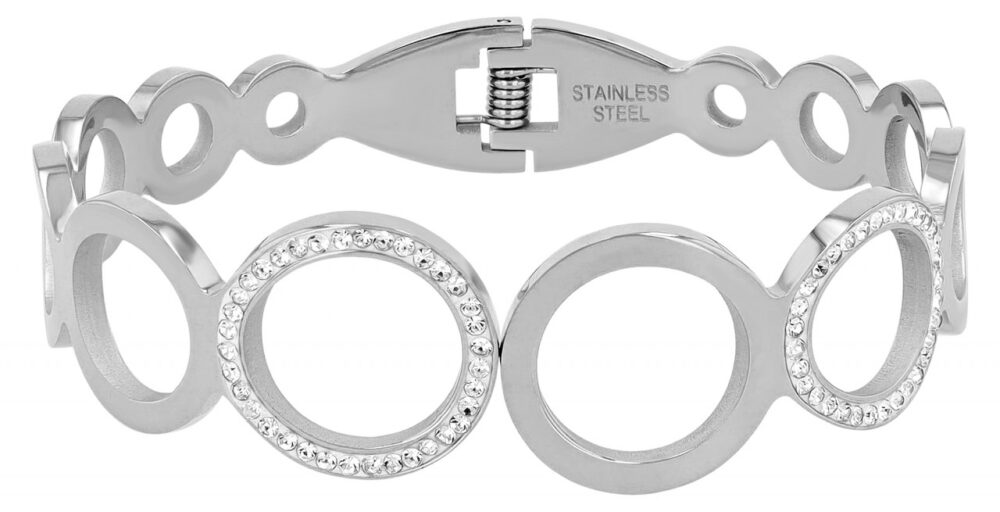 Allegra é uma elegante pulseira de aço inoxidável com um impressionante formato circular aberto. O arco rígido é equipado com um fecho prático de dobradiça de mola e é fácil de colocar e tirar. Ideal para detalhes elegantes no pulso. Use esta pulseira como uma peça de destaque durante o dia ou como um acessório glamouroso à noite.