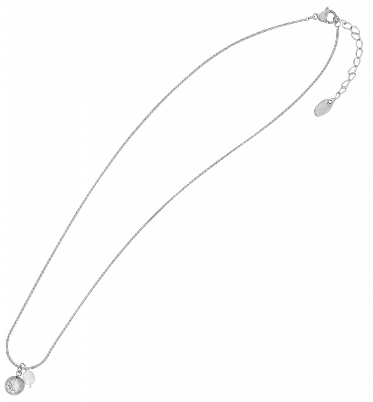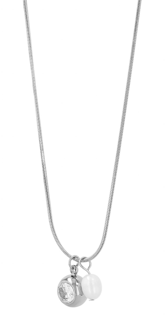 Feito de aço inoxidável de alta qualidade, nosso colar com dois pingentes incorpora não apenas elegância atemporal, mas também durabilidade e permanência. O aço inoxidável é resistente à corrosão e ao desbotamento, garantindo que a corrente mantenha sua beleza radiante mesmo após uso prolongado. O colar tem 41 cm de comprimento, com uma corrente de extensão adicional de 5 cm para personalização. O fecho seguro do mosquetão não só garante uma fixação firme, mas também um manuseio fácil. O coração deste colar encantador é o pingente com uma pedra simili (Ø 8 mm), com um ornamento adicional na parte de trás e um segundo pingente pequeno com uma delicada pérola de água doce. Os pingentes brilhantes irradiam uma beleza natural e dão ao colar uma elegância suave.