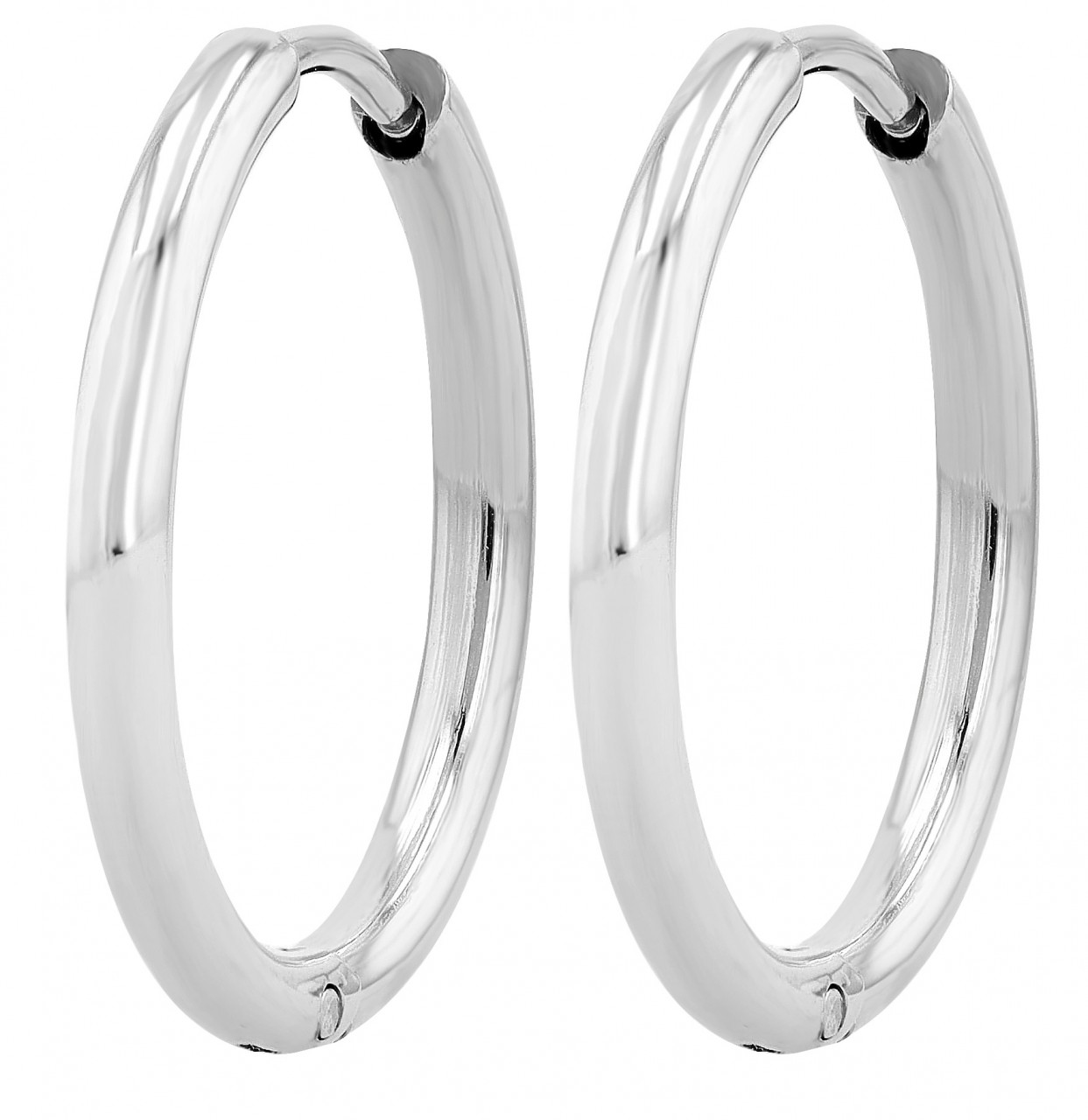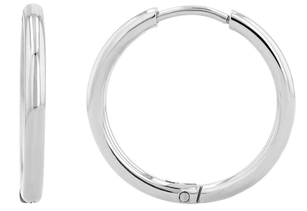 Os brincos de argolas redondas são feitos de aço inoxidável. O pino é empurrado para a outra extremidade do arco e pressionado para fechar. Com um diâmetro de 20 mm, uma largura de 2 mm e uma espessura de 2 mm.
