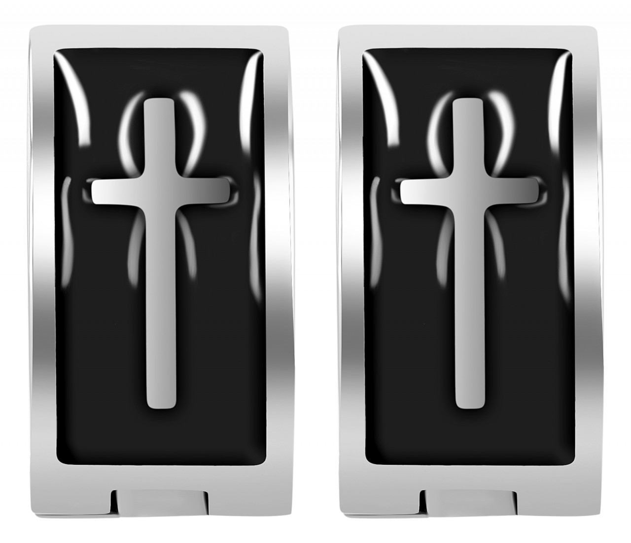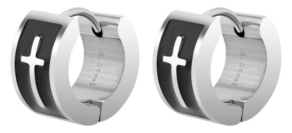 Brincos de argola com dobradiças em aço inoxidável bicolor. Os brincos de argola têm 7 mm de largura e um diâmetro interior de 9 mm. A parte da frente da argola apresenta uma cruz sobre um fundo preto.