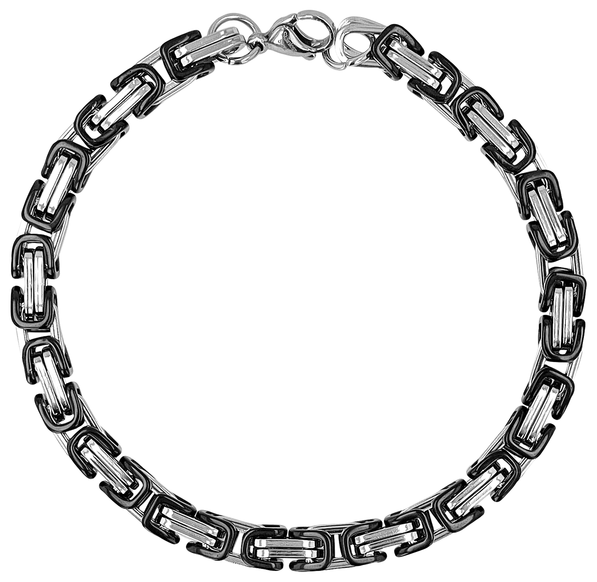 A pulseira bicolor da marca Akzent foi fabricada em aço inoxidável. Os elementos em aço inoxidável que formam o padrão real são prateados e pretos, o que confere à pulseira um visual especial. Tem um comprimento de 26cm, com uma espessura e largura de 6 mm. A pulseira pode ser aberta e fechada com um fecho de mola prateado, também feito de aço inoxidável.