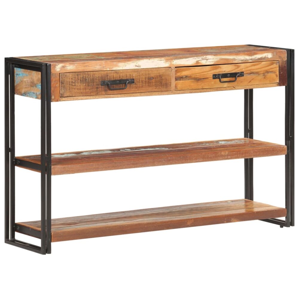 Mantenha a sua casa devidamente organizada com este elegante aparador de madeira! É um verdadeiro complemento decorativo para a sua casa. Este móvel de arrumação é feito em madeira recuperada maciça proveniente de vigotas, pisos e vigas de suporte de edifícios antigos que foram demolidos e pode consistir em diferentes tipos de madeira tais como acacia (pau-rosa), pinho, teca, faia, carvalho, cedro, madeira de mangueira, acácia etc. Isto significa que a madeira recuperada retém as características destes diferentes tipos de madeira. A madeira recuperada já está envelhecida, desgastada e seca, por isso não encolhe nem curva. Esta mesa consola é totalmente artesanal e os bonitos grãos da madeira tornam cada peça de mobiliário única e ligeiramente diferente das restantes. A forte estrutura em ferro revestido a pó contribui para a sua robustez. O tampo robusto é ideal para expor objetos decorativos, tais como molduras ou vasos com plantas. A mesa consola possui ainda 2 gavetas e 2 prateleiras, para que possa manter livros, revistas e outros artigos bem organizados e ao alcance. Nota importante: as cores podem variar de peça para peça, tornando cada uma das nossas peças única. A entrega é aleatória, assegurando a exclusividade e a individualidade do seu produto.