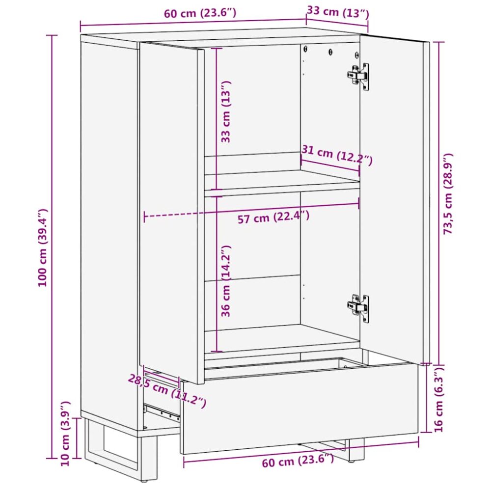 Este móvel alto oferece tanto decoração como arrumação prática, sendo um complemento perfeito para a sua casa. Material robusto e estável: a madeira de mangueira maciça, uma robusta madeira tropical, é altamente favorecida no fabrico de móveis dada a sua excecional durabilidade e resistência. Os bonitos grãos da madeira tornam cada peça de mobiliário ligeiramente diferente das restantes.Pés de metal: os pés de metal acrescentam um estilo calmo ao seu interior, assegurando ainda estabilidade.Amplo espaço de armazenamento: Este armário oferece amplo espaço de armazenamento para manter seus itens essenciais diários bem organizados e ao alcance.Porta prática: a porta do armário de arrumação fornece um espaço fechado que lhe permite manter os seus pertences organizados, protegidos e ocultos. Atenção:Para evitar que tombe, este produto deve ser utilizado com o dispositivo de fixação na parede fornecido. Dica útil:A cor e os grãos variam de peça para peça, tornando cada uma única. A entrega é aleatória, assegurando a exclusividade e a individualidade do seu produto.