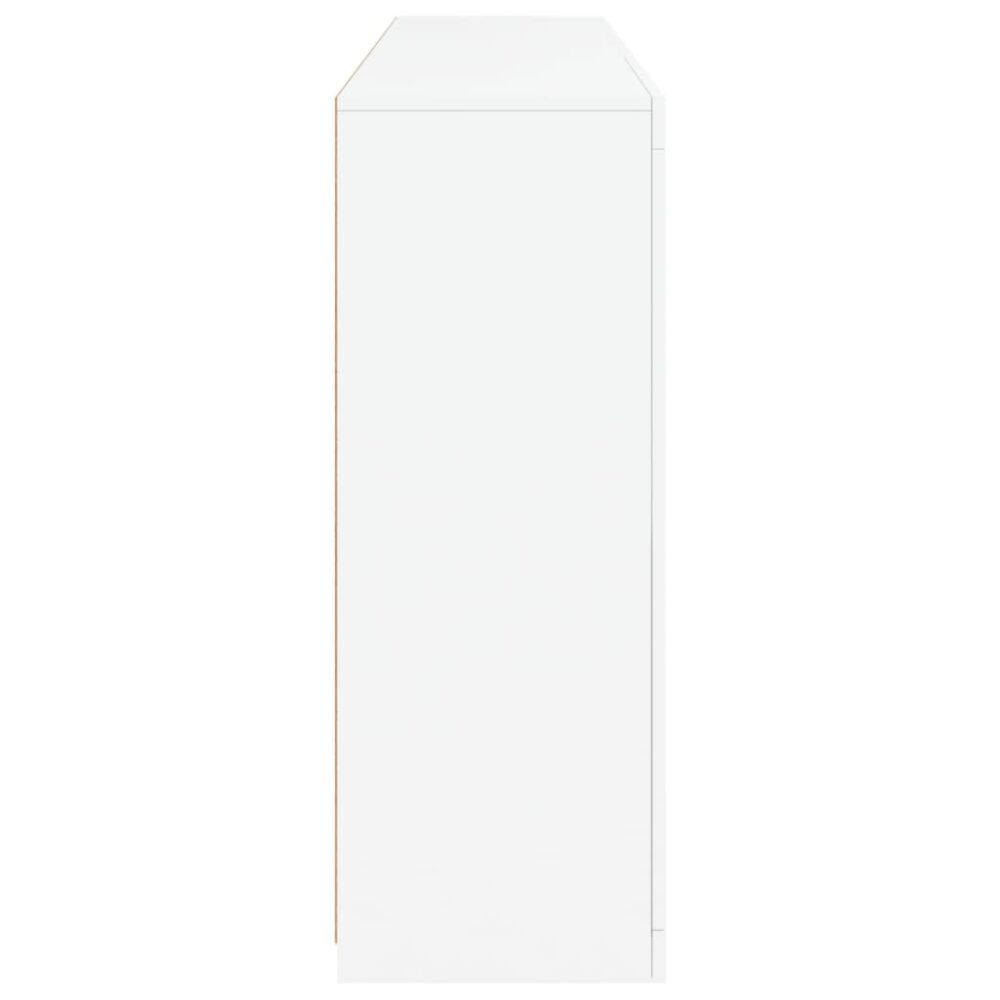 Decore a sua divisão com este aparador moderno com luzes LED que combina facilmente com mobília de qualquer estilo na sua casa. Material durável: os derivados de madeira possuem uma qualidade excecional e oferecem uma superfície suave bem como força, estabilidade e resistência à humidade.Luzes LED RGB: o armário buffet está equipado com luzes LED RGB vibrantes. Com vários menus personalizáveis, pode facilmente mudar a cor das luzes e até configurá-las para que se ajustem automaticamente. Estas luzes LED não só melhoram o aspeto contemporâneo do armário como também contribuem para o seu ar moderno.Amplo espaço de arrumação: o armário de armazenamento oferece muito espaço para manter os seus artigos do dia a dia devidamente organizados e facilmente acessíveis.Função de exposição: o tampo resistente do móvel de entrada é ideal para expor objetos decorativos, molduras ou vasos com plantas.Portas práticas: mantenha os seus artigos essenciais livres de pó, escondendo-os atrás das portas do móvel de apoio. Útil saber:O produto inclui um conetor USB que requer uma fonte de alimentação USB de 5V certificada (não incluída). Atenção:Para evitar que o produto se vire, deve utilizar o dispositivo de fixação na parede fornecido.
