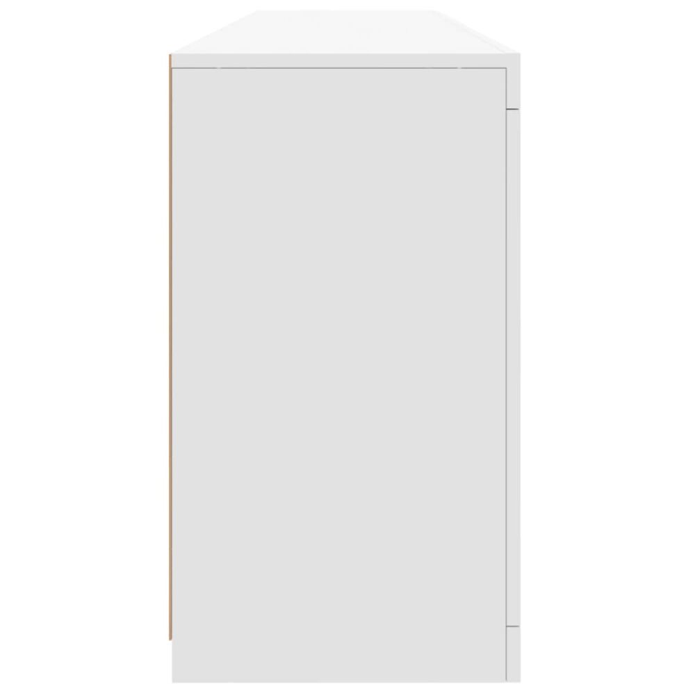 Decore a sua divisão com este aparador moderno com luzes LED que combina facilmente com mobília de qualquer estilo na sua casa. Material durável: os derivados de madeira possuem uma qualidade excecional e oferecem uma superfície suave bem como força, estabilidade e resistência à humidade.Luzes LED RGB: o armário buffet está equipado com luzes LED RGB vibrantes. Com vários menus personalizáveis, pode facilmente mudar a cor das luzes e até configurá-las para que se ajustem automaticamente. Estas luzes LED não só melhoram o aspeto contemporâneo do armário como também contribuem para o seu ar moderno.Amplo espaço de arrumação: o armário de armazenamento oferece muito espaço para manter os seus artigos do dia a dia devidamente organizados e facilmente acessíveis.Função de exposição: o tampo resistente do móvel de entrada é ideal para expor objetos decorativos, molduras ou vasos com plantas.Portas práticas: mantenha os seus artigos essenciais livres de pó, escondendo-os atrás das portas do móvel de apoio. Útil saber:O produto inclui um conetor USB que requer uma fonte de alimentação USB de 5V certificada (não incluída). Atenção:Para evitar que o produto se vire, deve utilizar o dispositivo de fixação na parede fornecido.
