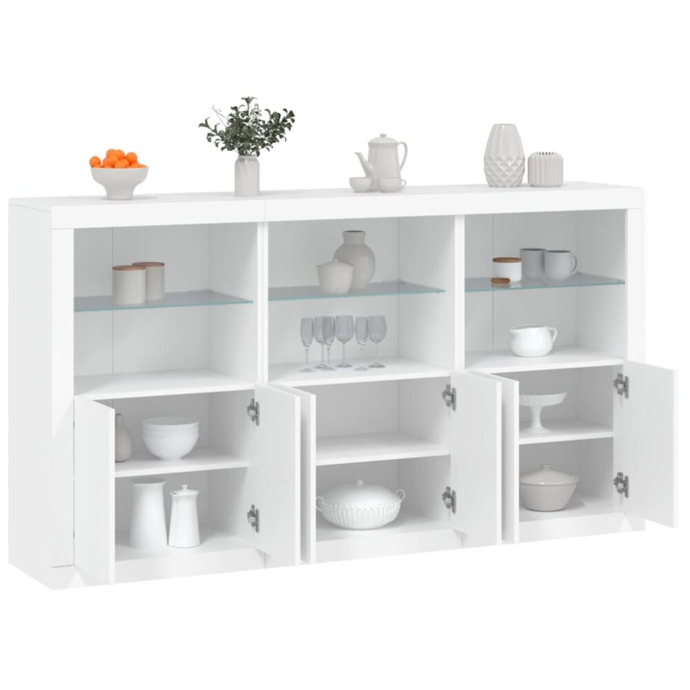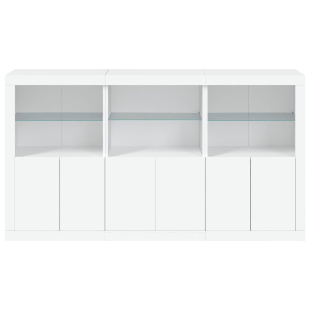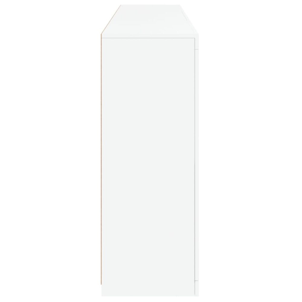 Decore a sua divisão com este aparador moderno com luzes LED que combina facilmente com mobília de qualquer estilo na sua casa. Material durável: os derivados de madeira possuem uma qualidade excecional e oferecem uma superfície suave bem como força, estabilidade e resistência à humidade.Luzes LED RGB: o armário buffet está equipado com luzes LED RGB vibrantes. Com vários menus personalizáveis, pode facilmente mudar a cor das luzes e até configurá-las para que se ajustem automaticamente. Estas luzes LED não só melhoram o aspeto contemporâneo do armário como também contribuem para o seu ar moderno.Amplo espaço de arrumação: o armário de armazenamento oferece muito espaço para manter os seus artigos do dia a dia devidamente organizados e facilmente acessíveis.Função de exposição: o tampo resistente do móvel de entrada é ideal para expor objetos decorativos, molduras ou vasos com plantas.Portas práticas: mantenha os seus artigos essenciais livres de pó, escondendo-os atrás das portas do móvel de apoio. Útil saber:O produto inclui um conetor USB que requer uma fonte de alimentação USB de 5V certificada (não incluída). Atenção:Para evitar que o produto se vire, deve utilizar o dispositivo de fixação na parede fornecido.