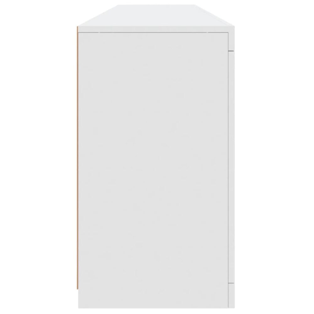 Decore a sua divisão com este aparador moderno com luzes LED que combina facilmente com mobília de qualquer estilo na sua casa. Material durável: os derivados de madeira possuem uma qualidade excecional e oferecem uma superfície suave bem como força, estabilidade e resistência à humidade.Luzes LED RGB: o armário buffet está equipado com luzes LED RGB vibrantes. Com vários menus personalizáveis, pode facilmente mudar a cor das luzes e até configurá-las para que se ajustem automaticamente. Estas luzes LED não só melhoram o aspeto contemporâneo do armário como também contribuem para o seu ar moderno.Amplo espaço de arrumação: o armário de armazenamento oferece muito espaço para manter os seus artigos do dia a dia devidamente organizados e facilmente acessíveis.Função de exposição: o tampo resistente do móvel de entrada é ideal para expor objetos decorativos, molduras ou vasos com plantas.Portas práticas: mantenha os seus artigos essenciais livres de pó, escondendo-os atrás das portas do móvel de apoio. Útil saber:O produto inclui um conetor USB que requer uma fonte de alimentação USB de 5V certificada (não incluída). Atenção:Para evitar que o produto se vire, deve utilizar o dispositivo de fixação na parede fornecido.