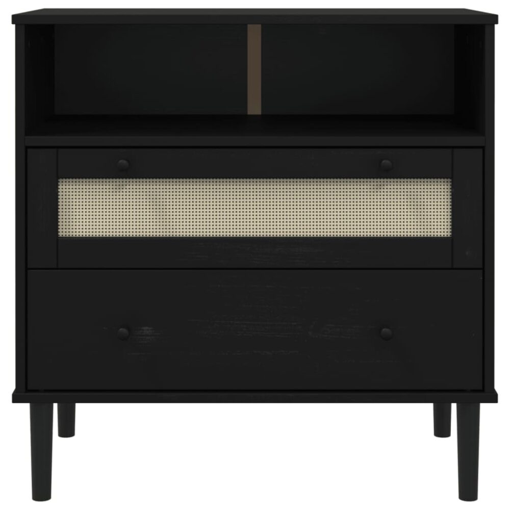 Este aparador de madeira, com um charme minimalista, foi concebido para ir ao encontro das suas necessidades de arrumação, acrescentando ainda um visual único à sua divisão. Madeira de pinho maciça: a madeira de pinho maciça é um bonito material natural. A madeira de pinho possui um grão reto e os nós dão ao material o seu aspeto rústico.Verniz UV: o verniz UV é um tipo especial de verniz cujo acabamento é realizado através de uma máquina de secar ultravioleta. Cria um acabamento mais vívido, luxuoso e tátil, quando comparado com os vernizes que não possuem a propriedade UV.Amplo espaço de arrumação: este aparador possui 2 gavetas e 1 compartimento, oferecendo um amplo espaço de arrumação para manter as suas revistas, livros, DVDs, dispositivos multimédia e outros artigos essenciais bem organizados e ao alcance.Superfície com aspeto de vime: a parte frontal da gaveta superior do móvel de arrumação foi feita à mão com vime PE, uma mistura entre uma tonalidade moderna de meados do século e uma tonalidade boho, que atribui um toque acolhedor e elegante ao seu espaço.Tampo robusto: o tampo robusto é perfeito para colocar vasos com plantas, molduras e outros artigos decorativos. Atenção:Para evitar que o produto se vire, deve utilizar o dispositivo de fixação na parede fornecido.