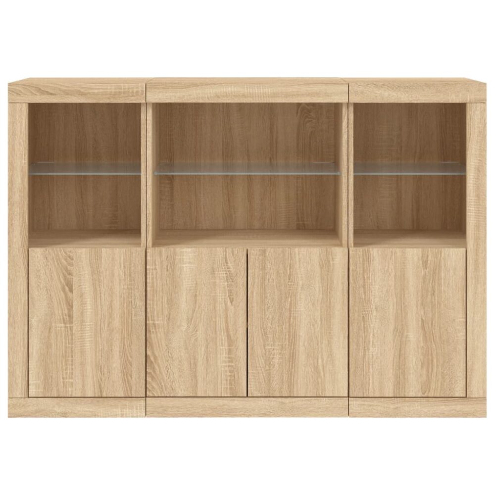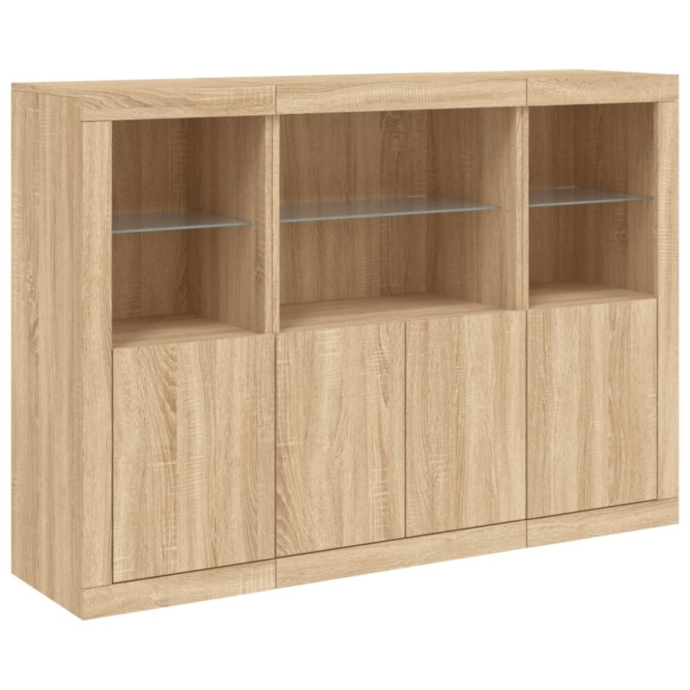 Decore a sua divisão com estes aparadores modernos com luzes LED que combinam facilmente com mobília de qualquer estilo na sua casa. Material durável: os derivados de madeira possuem uma qualidade excecional e oferecem uma superfície suave, bem como força, estabilidade e resistência à humidade.Amplo espaço de arrumação: estes armários buffet proporcionam bastante espaço de arrumação para manter as suas revistas, livros, controlos remotos e outros artigos bem organizados e ao alcance.Função de exposição: o tampo robusto destes aparadores são ideais para expor objetos decorativos, molduras ou vasos com plantas.Luzes LED ajustáveis: estes móveis de arrumação estão equipados com luzes LED RGB, que têm menus diferentes para mudar a cor das luzes e ajustá-las automaticamente, de forma a deixar a sua casa bonita e colorida. Atenção:Para evitar que o produto se vire, deve utilizar o dispositivo de fixação na parede fornecido.Útil saber:O produto inclui um conetor USB que requer uma fonte de alimentação USB de 5V certificada (não incluída).