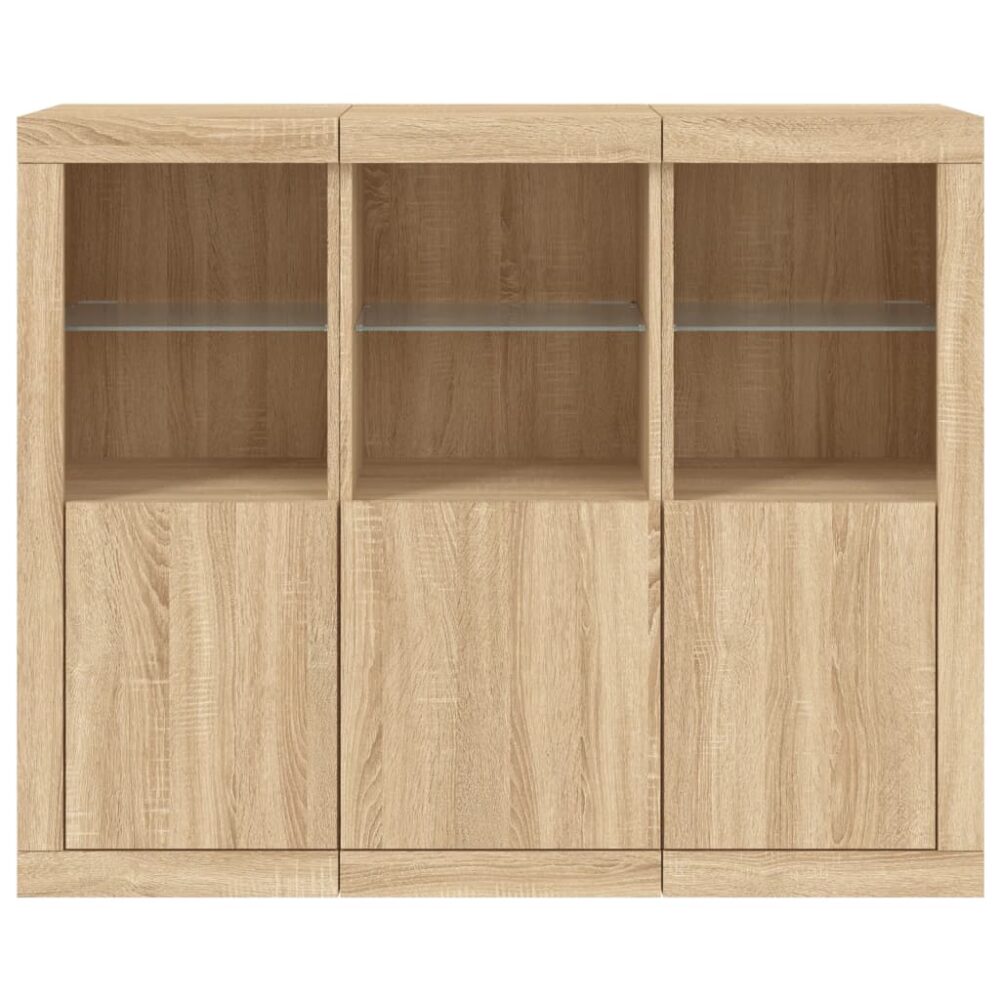Decore a sua divisão com estes aparadores modernos com luzes LED que combinam facilmente com mobília de qualquer estilo na sua casa. Material durável: os derivados de madeira possuem uma qualidade excecional e oferecem uma superfície suave, bem como força, estabilidade e resistência à humidade.Amplo espaço de arrumação: estes armários buffet proporcionam bastante espaço de arrumação para manter as suas revistas, livros, controlos remotos e outros artigos bem organizados e ao alcance.Função de exposição: o tampo robusto destes aparadores são ideais para expor objetos decorativos, molduras ou vasos com plantas.Luzes LED ajustáveis: estes móveis de arrumação estão equipados com luzes LED RGB, que têm menus diferentes para mudar a cor das luzes e ajustá-las automaticamente, de forma a deixar a sua casa bonita e colorida. Atenção:Para evitar que o produto se vire, deve utilizar o dispositivo de fixação na parede fornecido.Útil saber:O produto inclui um conetor USB que requer uma fonte de alimentação USB de 5V certificada (não incluída).