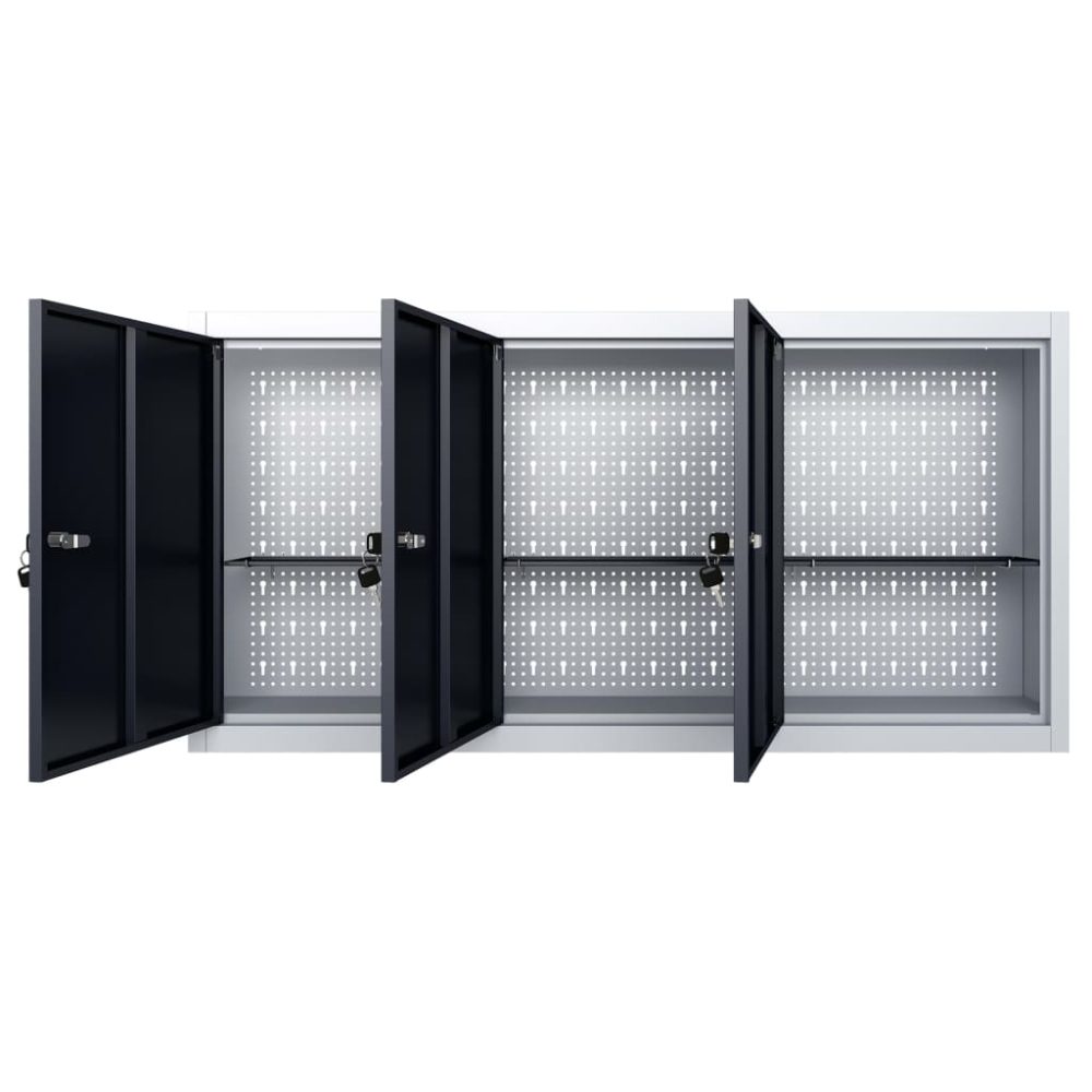 Esta unidade de armazenamento de ferramentas possui três prateleiras ajustáveis em altura e uma placa perfurada com furos Euro que podem ser utilizados para pendurar vários tipos de ferramentas tais como chaves inglesas, alicates, martelos etc. Equipado com três portas bloqueáveis (2 chaves incluídas para cada porta), o armário de ferramentas oferece uma segurança extra. É feito de metal com um revestimento antirriscos forte, tornando-o durável e fácil de limpar. O produto precisa de ser montado.