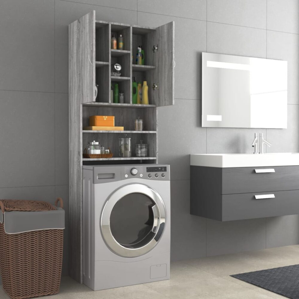 Com este armário para máquina de lavar roupa, pode criar e otimizar espaço de arrumação adicional na casa de banho ou lavandaria. Material de qualidade: a madeira processada possui uma qualidade excecional e oferece uma superfície suave bem como força, estabilidade e resistência à humidade.Amplo espaço de arrumação: as 2 portas e os 9 compartimentos oferecem um amplo espaço de arrumação para manter os seus utensílios de lavandaria, material de limpeza, artigos de higiene pessoal e outros produtos bem organizados e ao seu alcance.Função de poupança de espaço: esta unidade de prateleiras para máquina de lavar consegue utilizar eficazmente a área de arrumação desperdiçada por cima da máquina de lavar ou da sanita.Limpeza fácil: este armário para máquina de lavar…