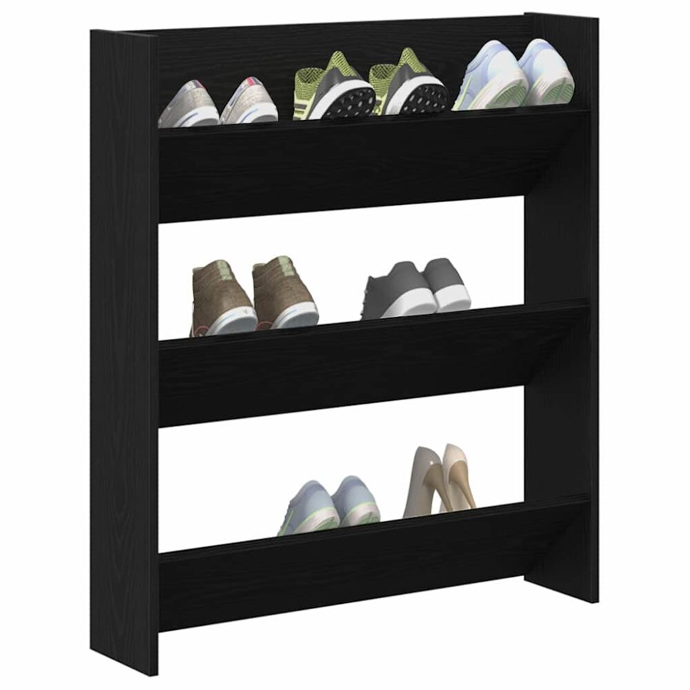 Este armrio para sapatos montado na parede uma soluo prtica para manter os sapatos organizados. Ideal para entradas ou corredores, combina estilo e funcionalidade. Com trs prateleiras, os sapatos ficam vista e facilmente acessveis, maximizando o espao. Perfeito para adultos, encaixa-se bem em qualquer casa moderna, melhorando a decorao de forma til. O acabamento em carvalho preto moderno adiciona classe, harmonizando com designs minimalistas e atuais. Feito de madeira engenheirada resistente, suporta o uso dirio, garantindo durabilidade. excelente para quem quer manter tudo arrumado enquanto fica bonito!