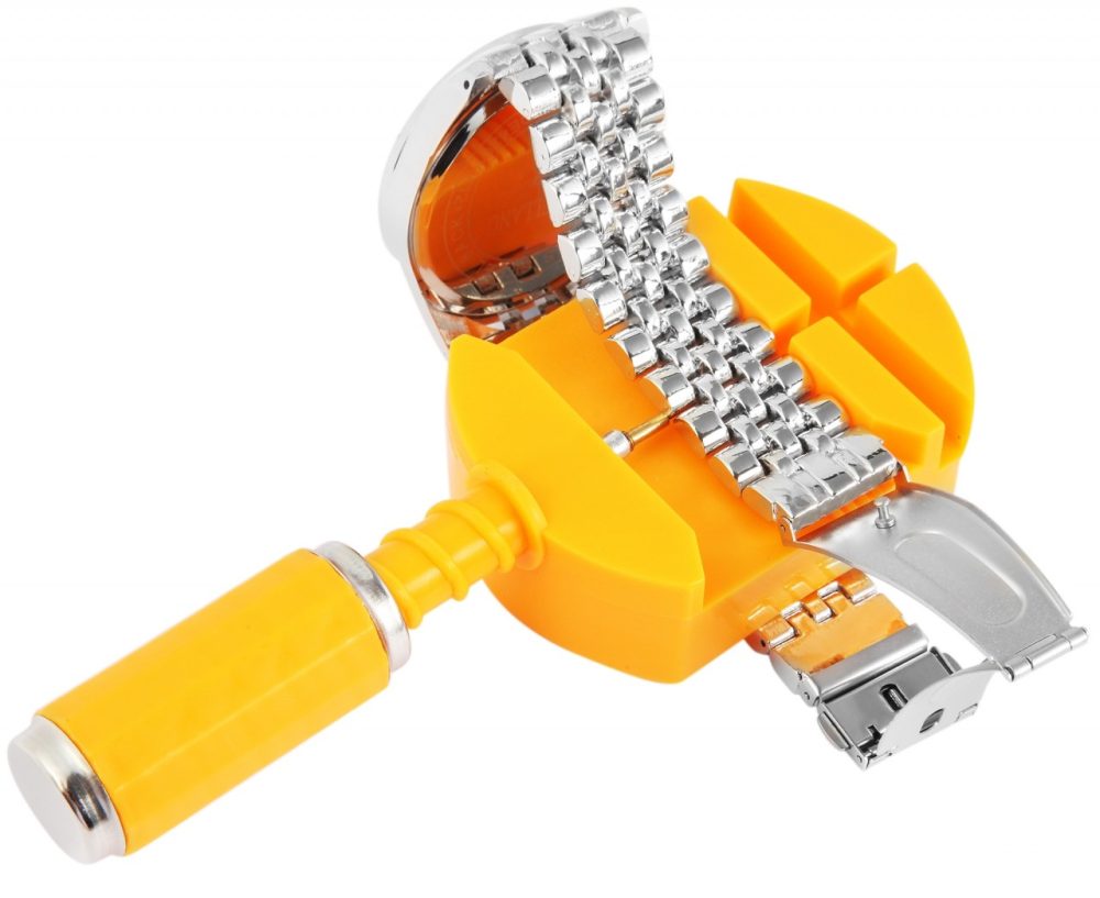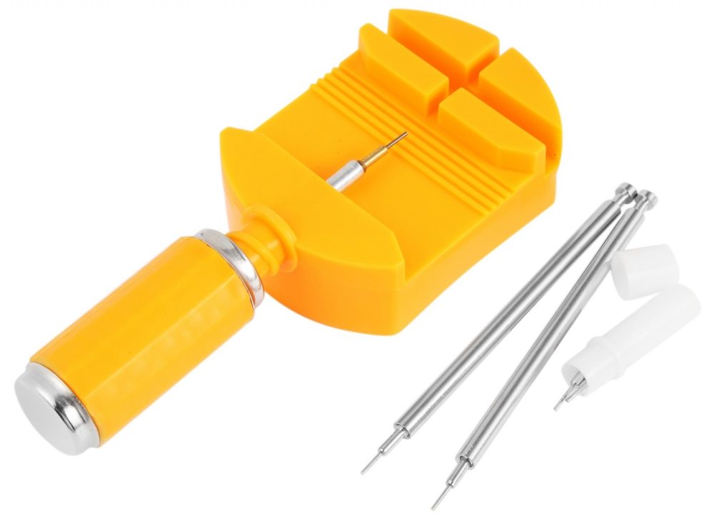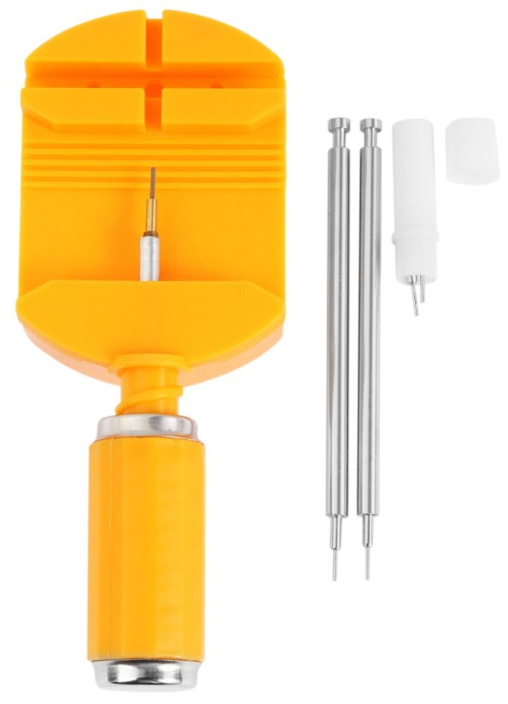 O conjunto de encurtador de pulseira de 6 peças contém: 1 encurtador de pulseira, 3 pontas de reposição e 2 pinos de disparo. O conjunto de encurtador de pulseira de plástico ajustável facilita o encurtamento de pulseiras de relógio usando o controle deslizante na lateral. As dimensões do encurtador de pulseira são: comprimento 11,1 cm e largura 4,7 cm. As dimensões dos pinos de disparo são: comprimento 8,4 e diâmetro de 0,1 cm.