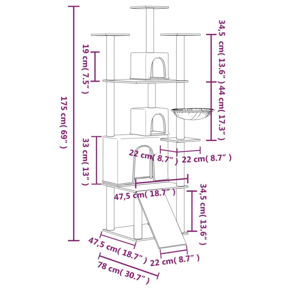 Árvore p/ gatos c/ postes arranhadores sisal 175 cm cinza-claro - PORTES GRÁTIS