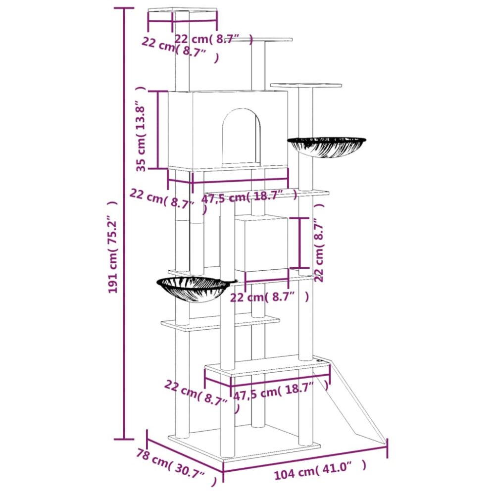 Com esta árvore para gatos, os seus amigos peludos podem experimentar o gosto do luxo! Os seus gatos vão gostar de arranhar, trepar, empoleirar-se, esconder-se e descansar nesta árvore. Torre para gatos tudo-em-um: a torre arranhadora para gatos, com vários níveis, oferece ao seu gato um lugar divertido e compacto onde brincar, fazer exercício e uma casa quente para uma boa sesta. Possui uma escada, 2 casas, 2 cestos e plataformas.Pelúcia confortável: a cobertura de pelúcia amiga da pele e felpuda permite que os seus amigos felinos brinquem com todo o conforto.Corda de sisal durável: os postes deste centro de atividades felino foram enrolados com corda de sisal natural, o que oferece aos gatos uma espaço saudável para arranhar. Nota:Cada produto é fornecido com um manual de instruções na caixa para facilitar a montagem.