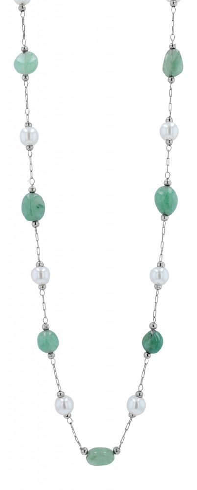 Colar em aço inoxidável “Asude” com pérolas e pedras de água doce verde menta alternadas. Dimensões: 41 cm + 5 cm de extensão.