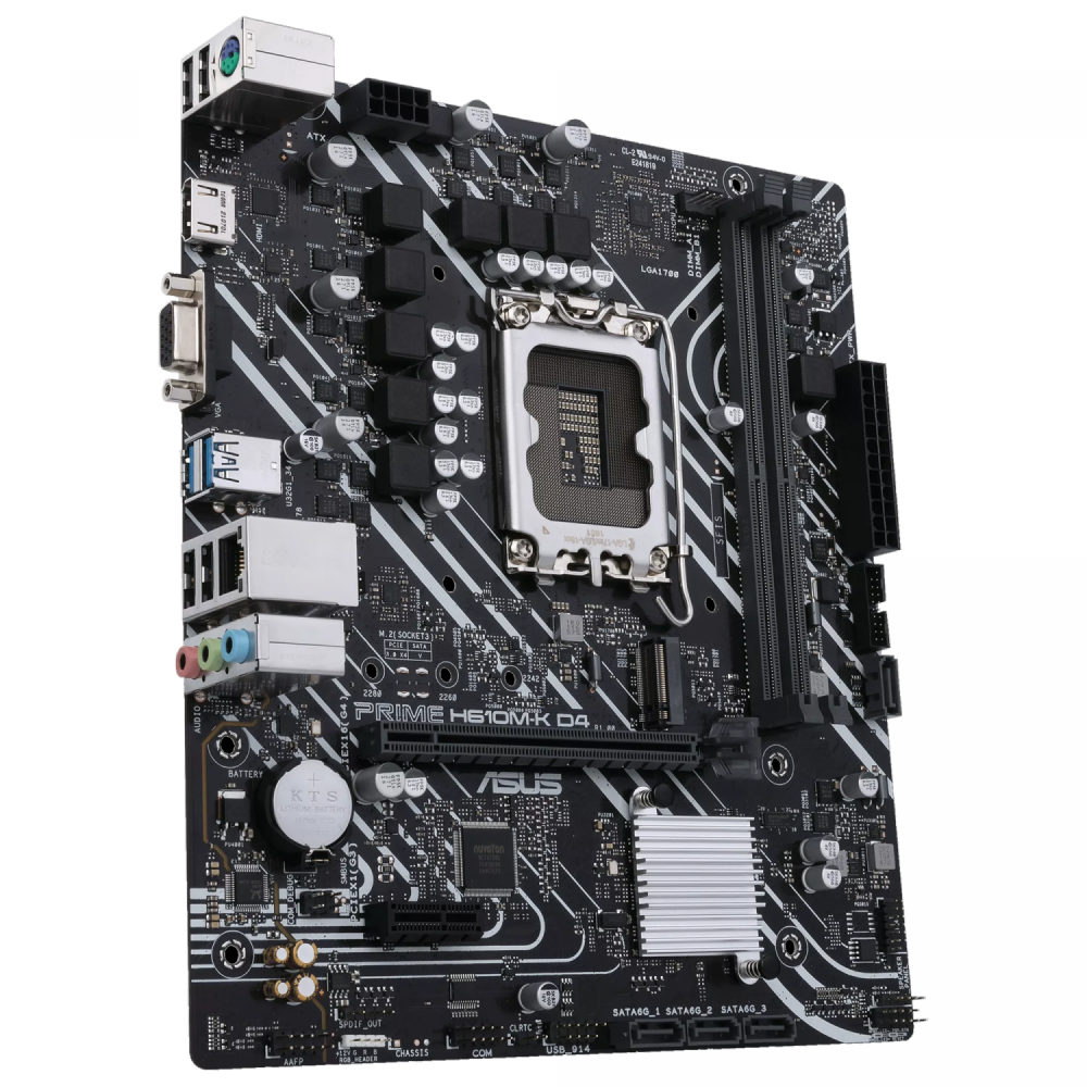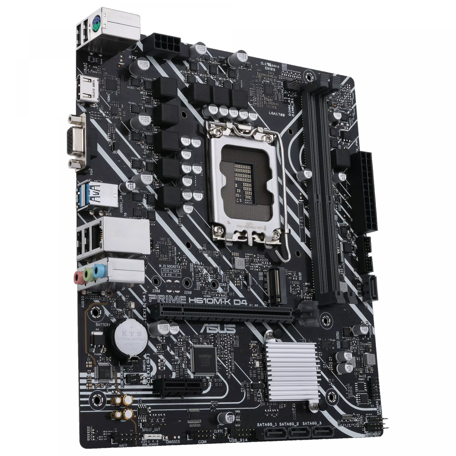 - Placa-mãe Intel® H610 (LGA 1700) mic-ATX com DDR4, PCIe 4.0, slot M.2, Realtek 1 Gb Ethernet, HDMI®, D-Sub, DVI, portas USB 3.2 Gen 1, SATA 6 Gbps, conector COM, LPT cabeçalho, cabeçalho TPM