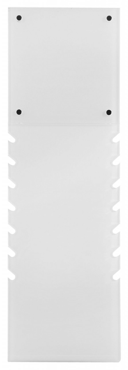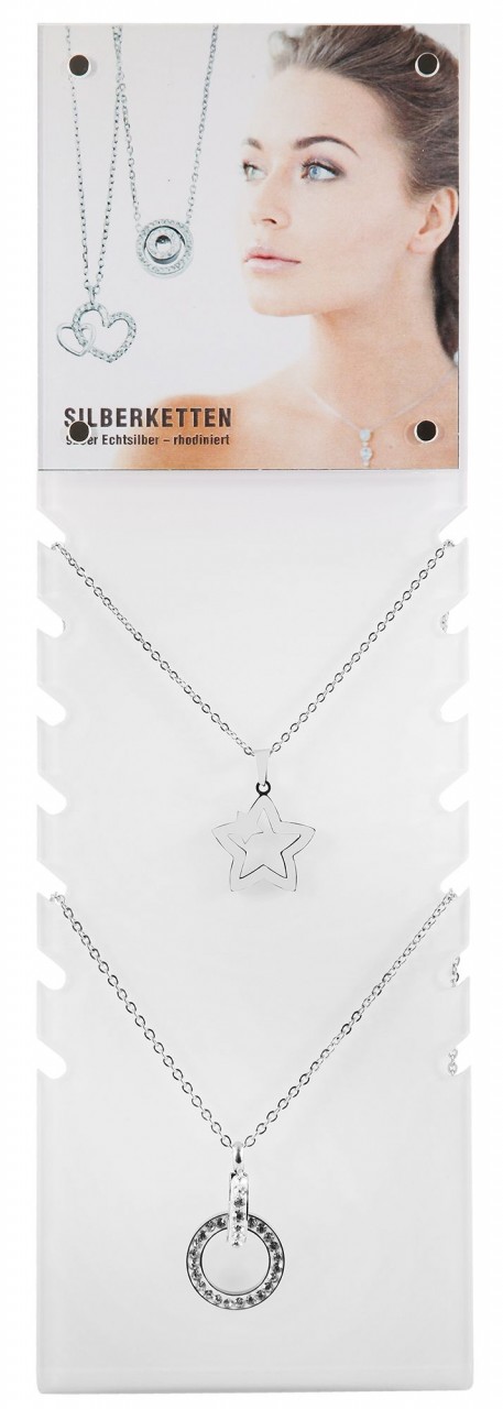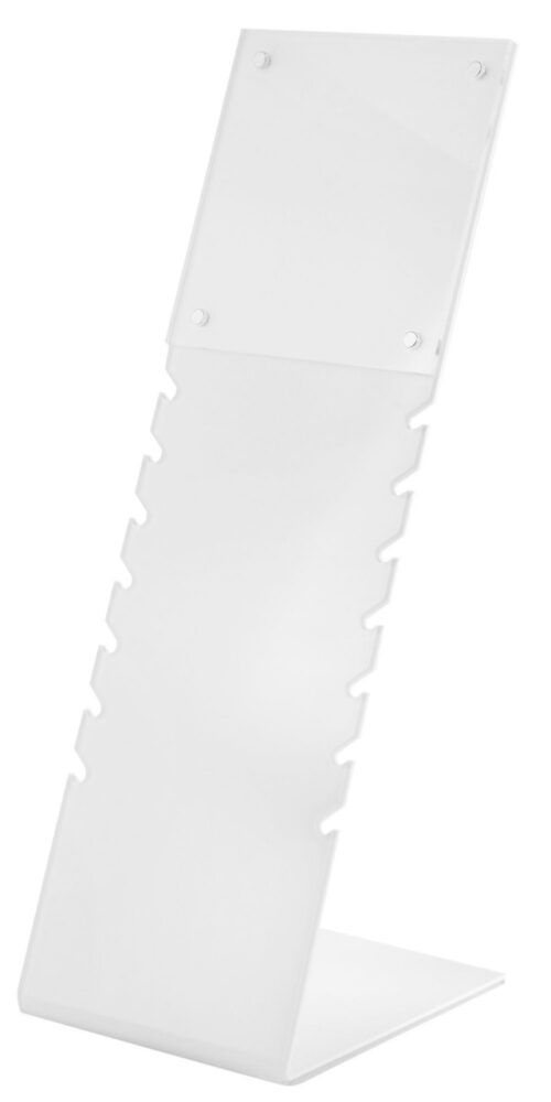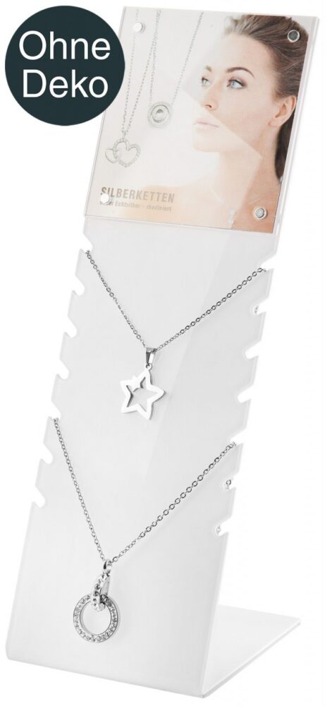 Expositor de joias de plástico para colares na cor branca com imagem correspondente (sem decoração). Dimensões: 25 x 10 x 8 cm
