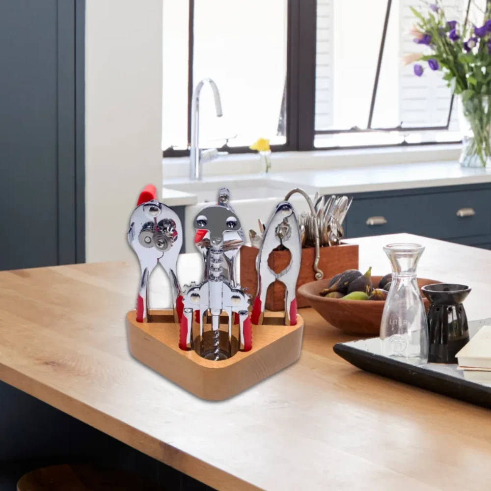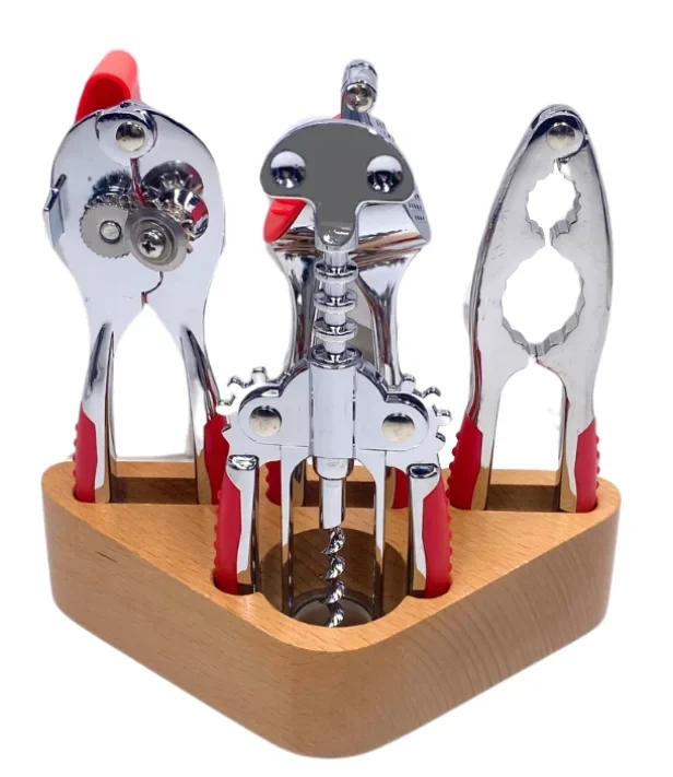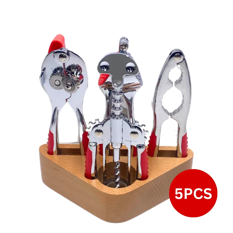 - Conjunto completo de 5 peças – Inclui um saca-rolhas, quebra-nozes, espremedor de alho, abridor de latas e um suporte de madeira para todas as suas tarefas essenciais na cozinha. Este conjunto oferece uma variedade versátil de ferramentas necessárias para as tarefas diárias da cozinha, tornando-o conveniente para abrir garrafas de vinho, quebrar nozes, picar alho e abrir latas, tudo organizado em um suporte de madeira.