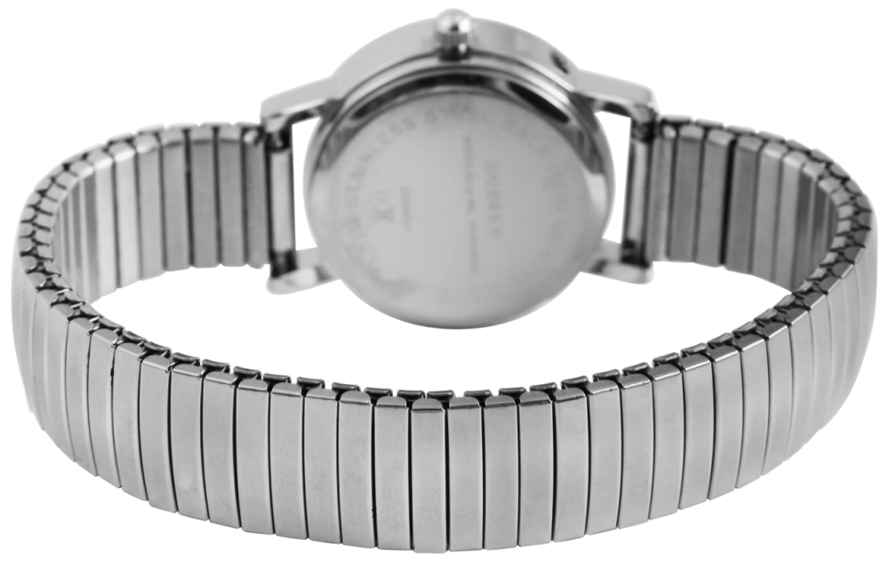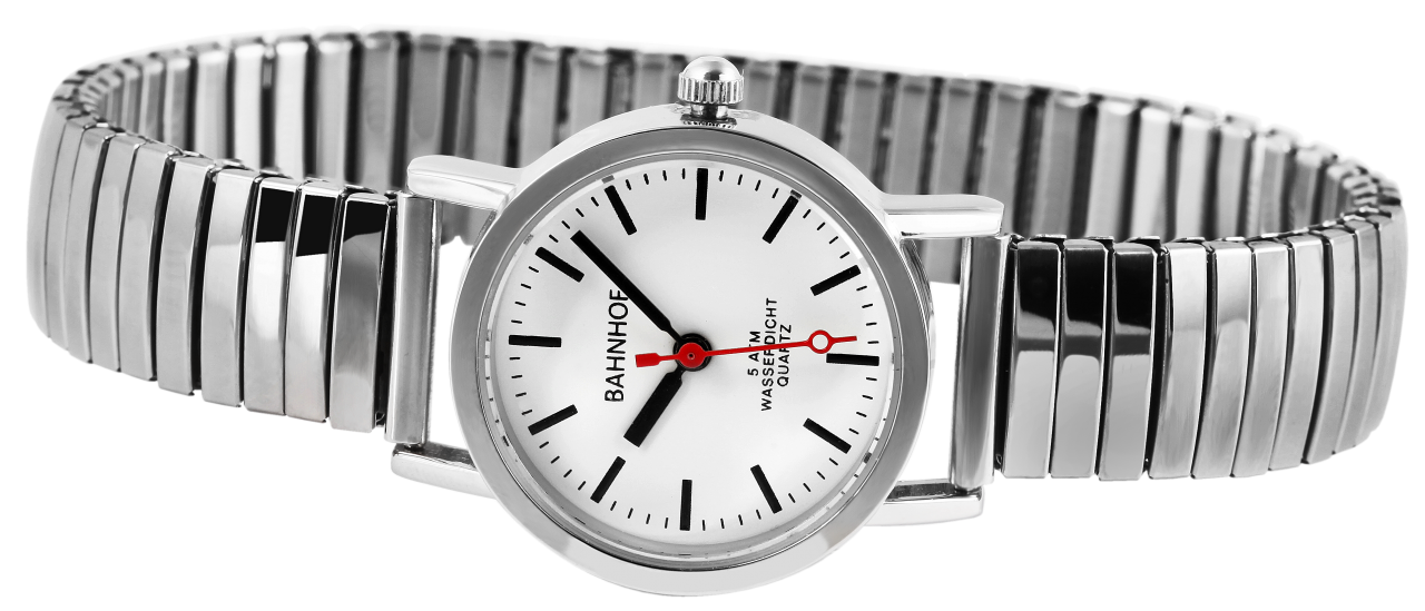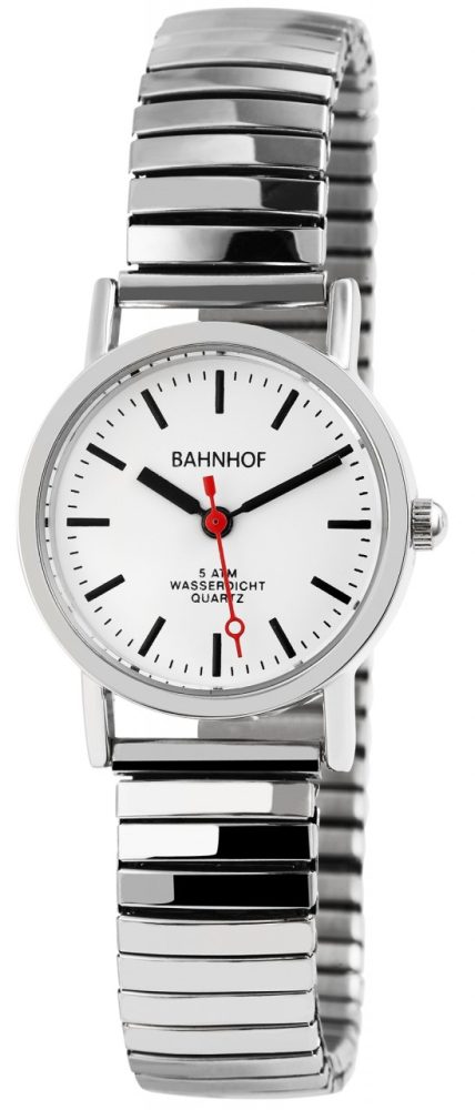 O relógio de pulso analógico de 3 ponteiros para mulher da marca Bahnhof possui um movimento de quartzo de alta qualidade. A bracelete de puxar em aço inoxidável prateado tem 14 mm de largura no lug e é particularmente confortável e fácil de puxar sobre o pulso graças à bracelete flexível. O comprimento total do relógio é de 19 cm. A caixa metálica prateada com vidro mineral tem um diâmetro de 26 mm e uma altura de 9 mm. O fundo da caixa é feito de aço inoxidável. A divisão do mostrador branco é simples, os ponteiros das horas e dos minutos e os índices são pretos, o ponteiro dos segundos – típico de um relógio de estação ferroviária – é vermelho. O relógio tem também uma resistência à água de 5 ATM.
