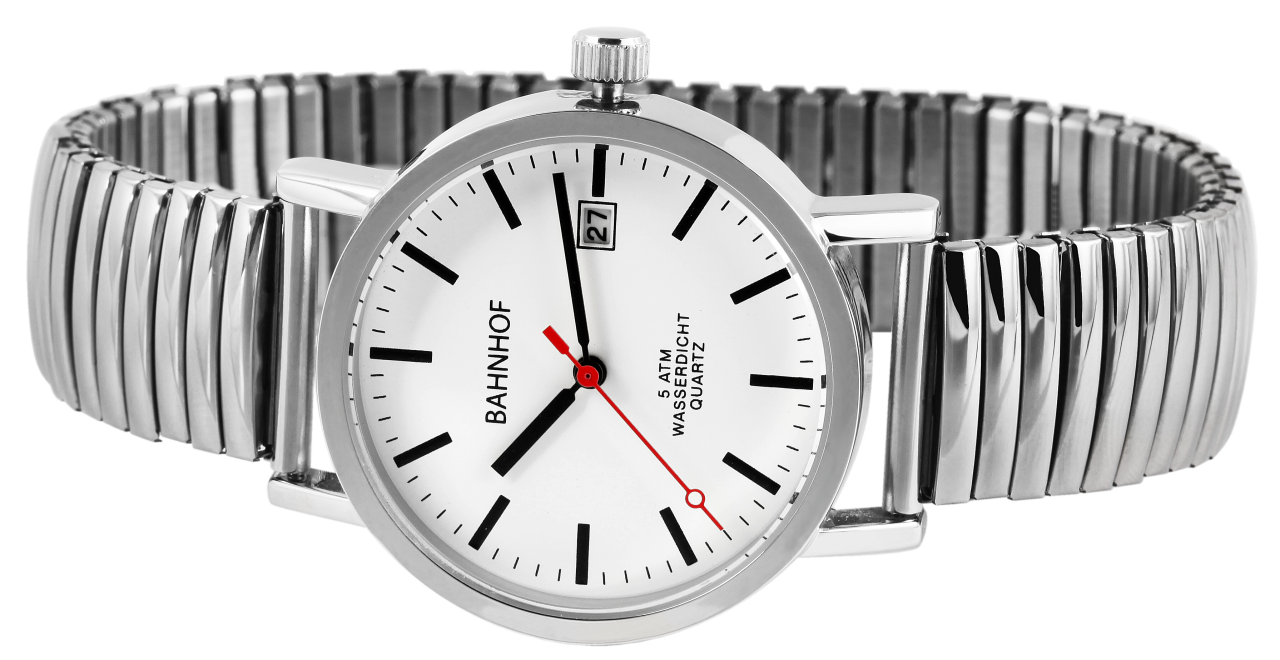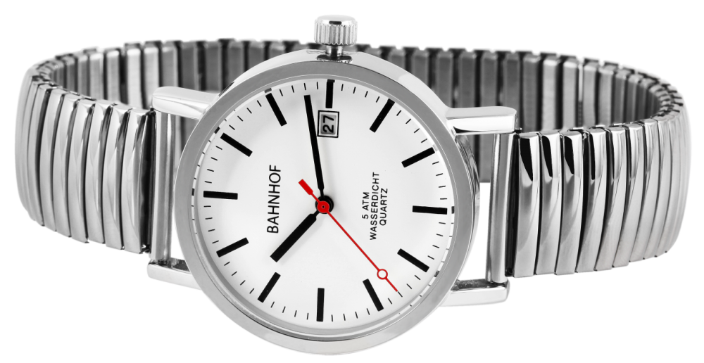 O relógio de pulso analógico de 3 ponteiros para homem da marca Bahnhof possui um movimento de quartzo de alta qualidade. A bracelete de puxar em aço inoxidável prateado tem 18 mm de largura no lug e é particularmente confortável e fácil de puxar sobre o pulso graças à bracelete flexível. O comprimento total do relógio é de 20 cm. A caixa metálica prateada com vidro mineral tem um diâmetro de 35 mm e uma altura de 9 mm. O fundo da caixa é feito de aço inoxidável. A divisão do mostrador branco é simples, os ponteiros das horas e dos minutos e os índices são pretos, o ponteiro dos segundos – típico de um relógio de estação ferroviária – é vermelho. O relógio para homem tem também uma indicação da data às três horas e é resistente à água até 5 ATM.