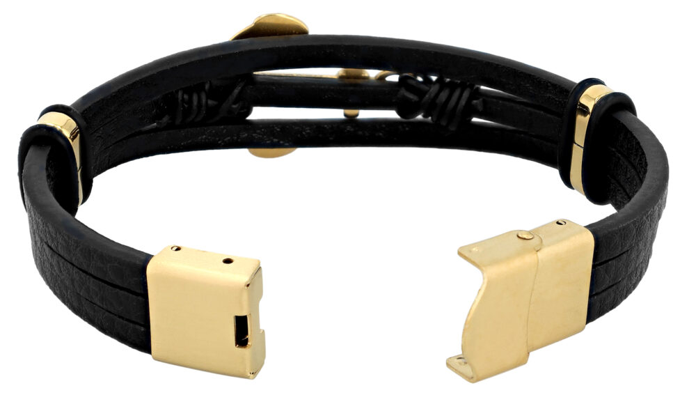 • Quatro outros elementos de anel são feitos de borracha. A bracelete em pele preta lisa é composta por três tiras finas em pele, unidas por uma âncora no centro.