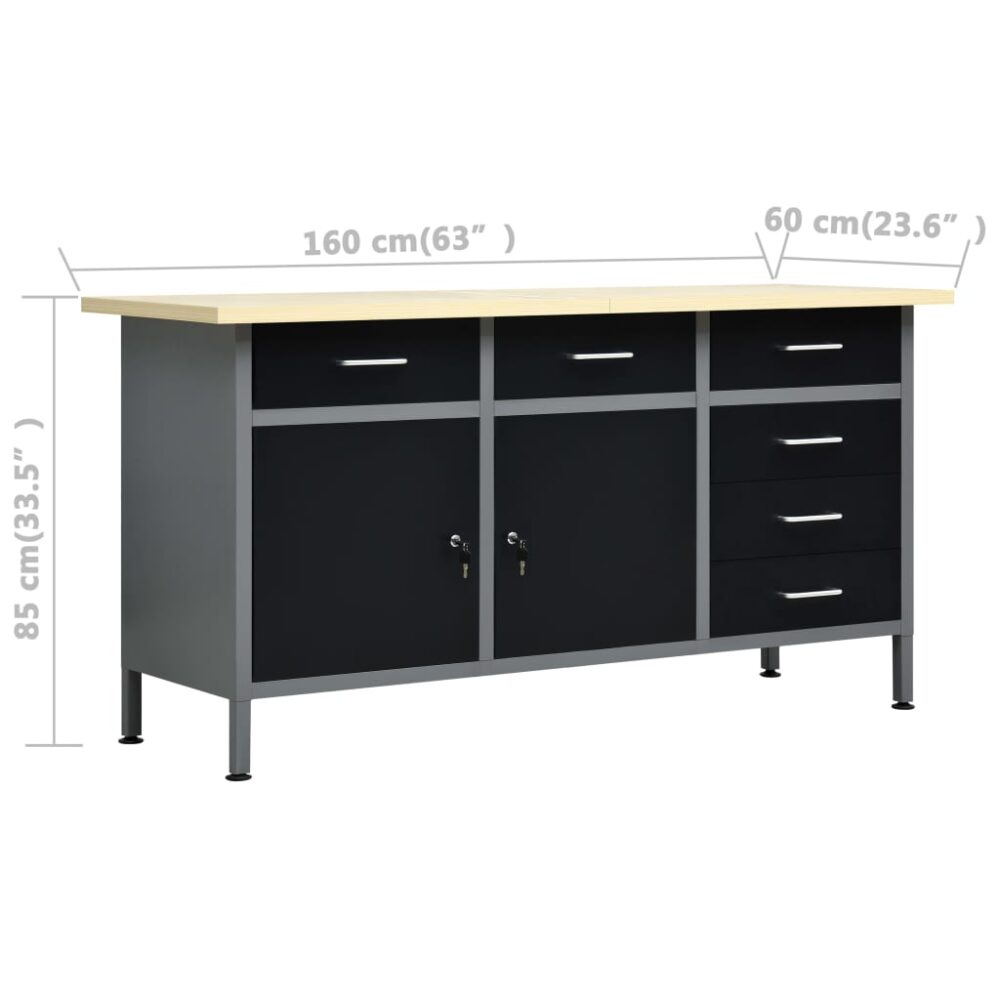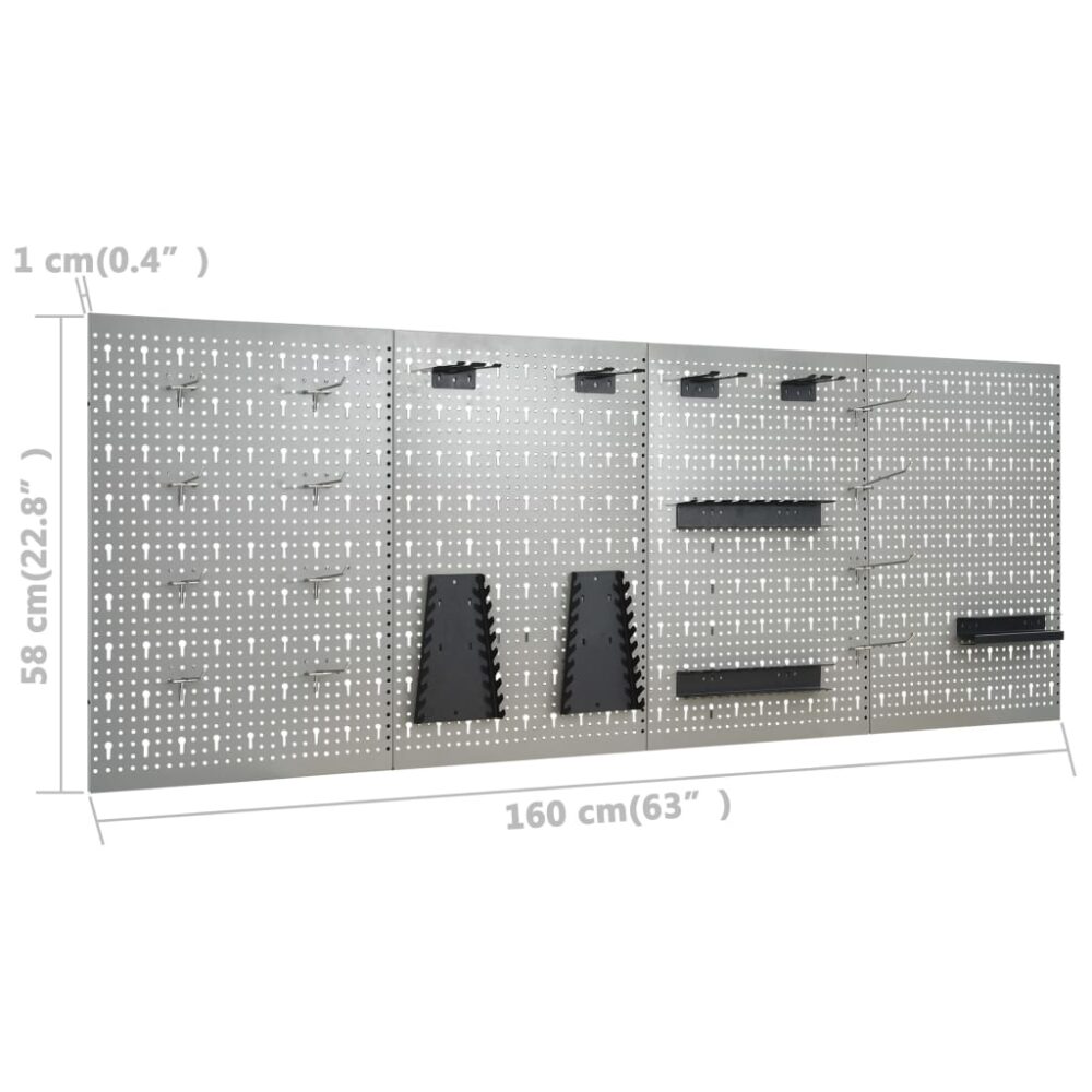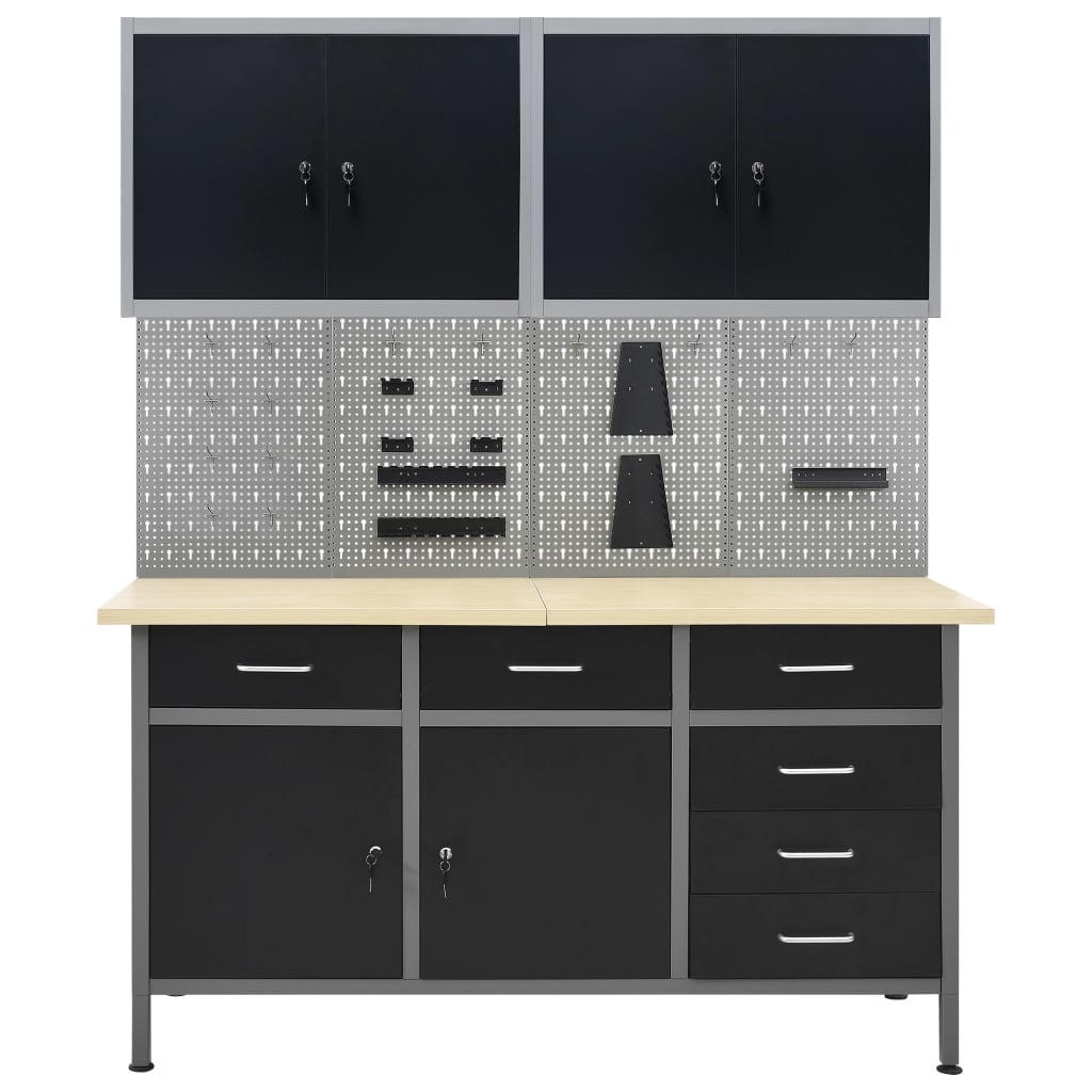 Este conjunto combina 1 bancada de trabalho, 4 painéis de parede e 2 armários de parede, que serão uma solução prática de armazenamento para a sua oficina e garagem. A bancada de trabalho robusta destaca-se pelo amplo espaço de arrumação e capacidade de carga de 500 kg. O tampo grande e resistente fornece uma base estável para todos os seus trabalhos. A bancada possui 6 gavetas, permitindo-lhe organizar corretamente as suas ferramentas, peças e acessórios tais como parafusos, pregos e fita adesiva. Todas as gavetas estão equipadas com um mecanismo de rolamento de esferas para um deslize suave. Existem 2 prateleiras e um grande compartimento com 2 portas com fechaduras, onde poderá acomodar berbequins, tambores de cabo e rebarbadoras. Os pés são ajustáveis em altura. Esta estação de trabalho é fabricada em aço e contraplacado de qualidade, tornando-a mais resistente, durável e fácil de limpar. É fácil de montar. Esses painéis para ferramentas fabricados em aço sólido podem suportar o peso de várias ferramentas, tais como brocas, alicates, chaves de fendas e outras chaves. Os painéis estão perfurados para fixar ferramentas com facilidade e segurança. Os 4 painéis de parede podem ser fixados em conjunto para maior rigidez. É um complemento ideal para os seus armários de bancada e oficina com uma largura prática de 160 cm. A unidade de armazenamento de ferramentas possui duas prateleiras ajustáveis em altura e uma placa perfurada com furos que podem ser utilizados para pendurar vários tipos de ferramentas tais como chaves inglesas, alicates, martelos etc. Equipado com duas portas com fechaduras (2 chaves incluídas para cada porta), o armário de ferramentas oferece uma segurança extra. É feito de metal com um revestimento antirriscos forte, tornando-o durável e fácil de limpar. O produto requer montagem.