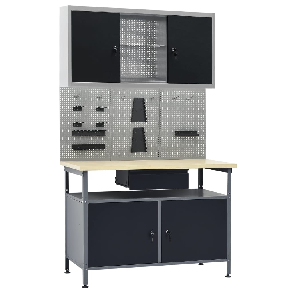 Este conjunto combina 1 bancada de trabalho, 3 painéis de parede e 1 armário de parede, que serão uma solução prática de armazenamento para a sua oficina e garagem.