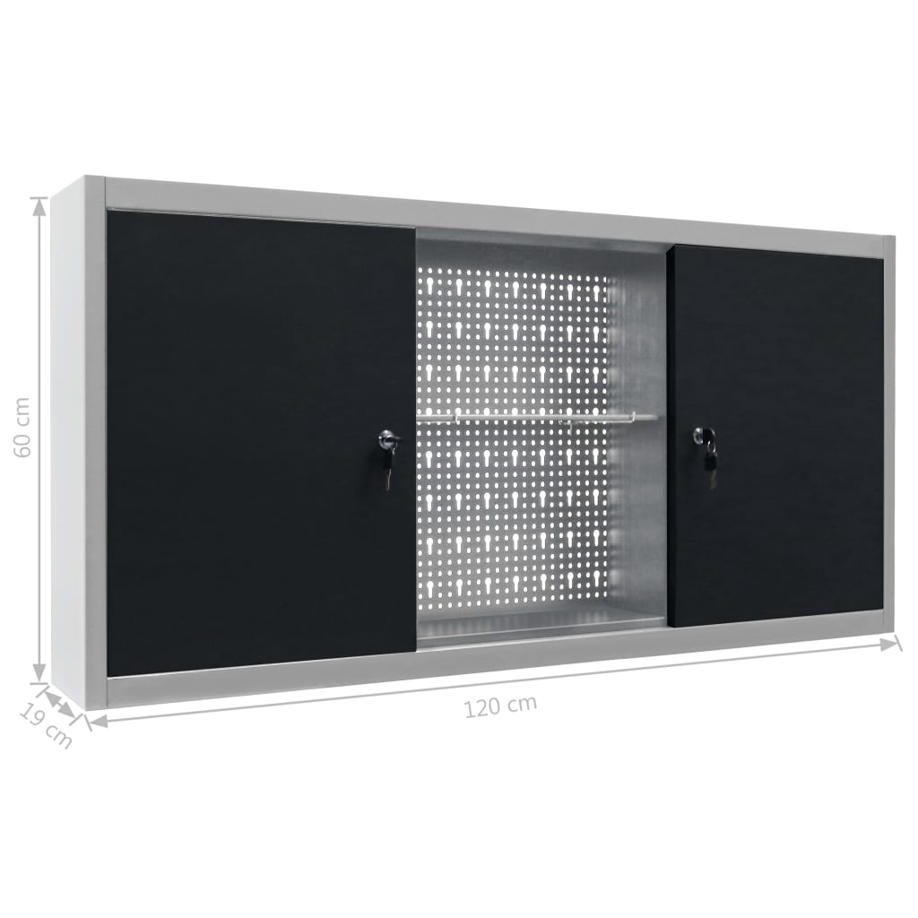 A unidade de armazenamento de ferramentas possui três prateleiras ajustáveis em altura e uma placa perfurada com furos que podem ser utilizados para pendurar vários tipos de ferramentas tais como chaves inglesas, alicates, martelos etc. Equipado com duas portas bloqueáveis (2 chaves incluídas para cada porta), o armário de ferramentas oferece uma segurança extra. É feito de metal com um revestimento antirriscos forte, tornando-o durável e fácil de limpar. O produto precisa de ser montado.