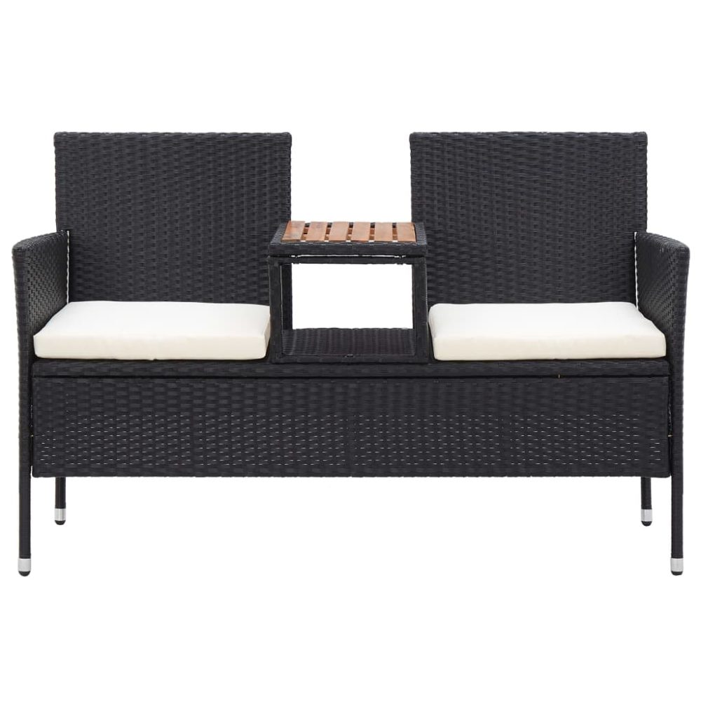 Graças ao vime PE impermeável e resistente às intempéries, o conjunto de bancos é fácil de limpar, robusto e adequado para uma utilização diária. O banco possui uma estrutura de ferro revestido a pó resistente e durável. Também é leve, facilitando a deslocação. Os dois assentos estão ligados por uma mesa de centro, na qual pode convenientemente manter as suas bebidas ou livros favoritos à mão. Os almofadões de assento são espessos, removíveis e muito confortáveis. As capas de poliéster fáceis de limpar, com fechos ocultos, podem ser removidas e lavadas.