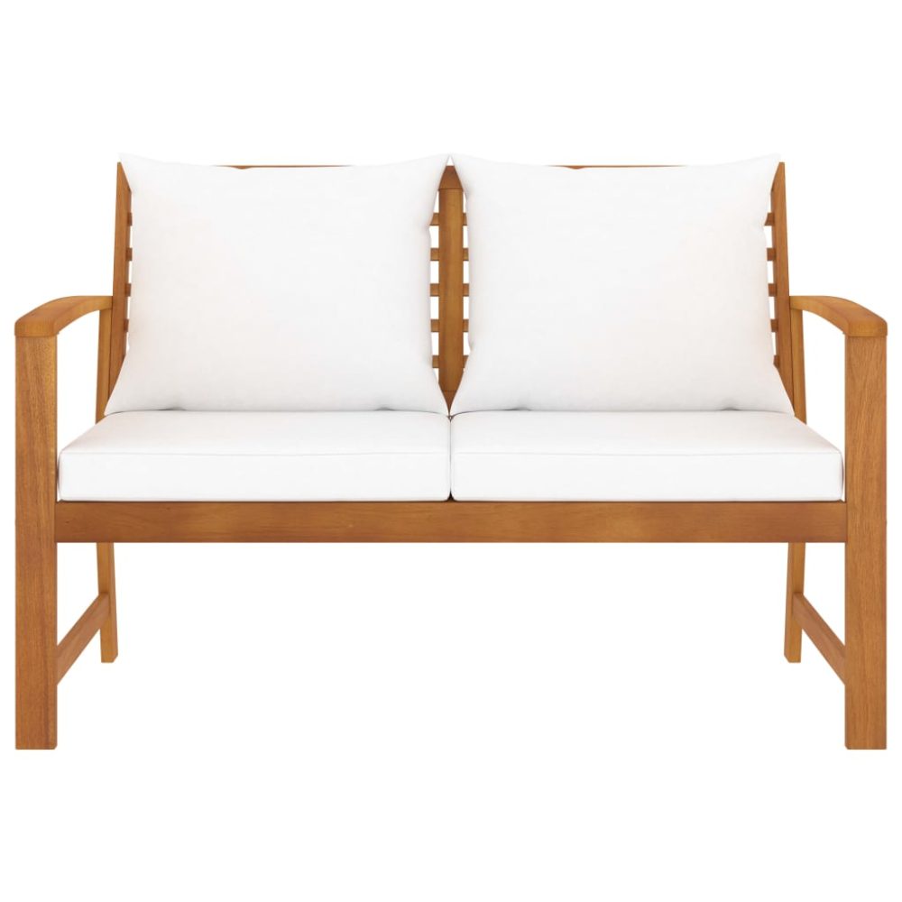 O banco é feito em madeira de acácia maciça de alta qualidade, uma madeira tropical resistente às intempéries e altamente durável. Graças ao acabamento a óleo, o conjunto de móveis de pátio apresenta uma cor quente e é fácil de limpar e cuidar. A entrega inclui ainda almofadões de assento e de encosto espessamente acolchoados para o máximo conforto.