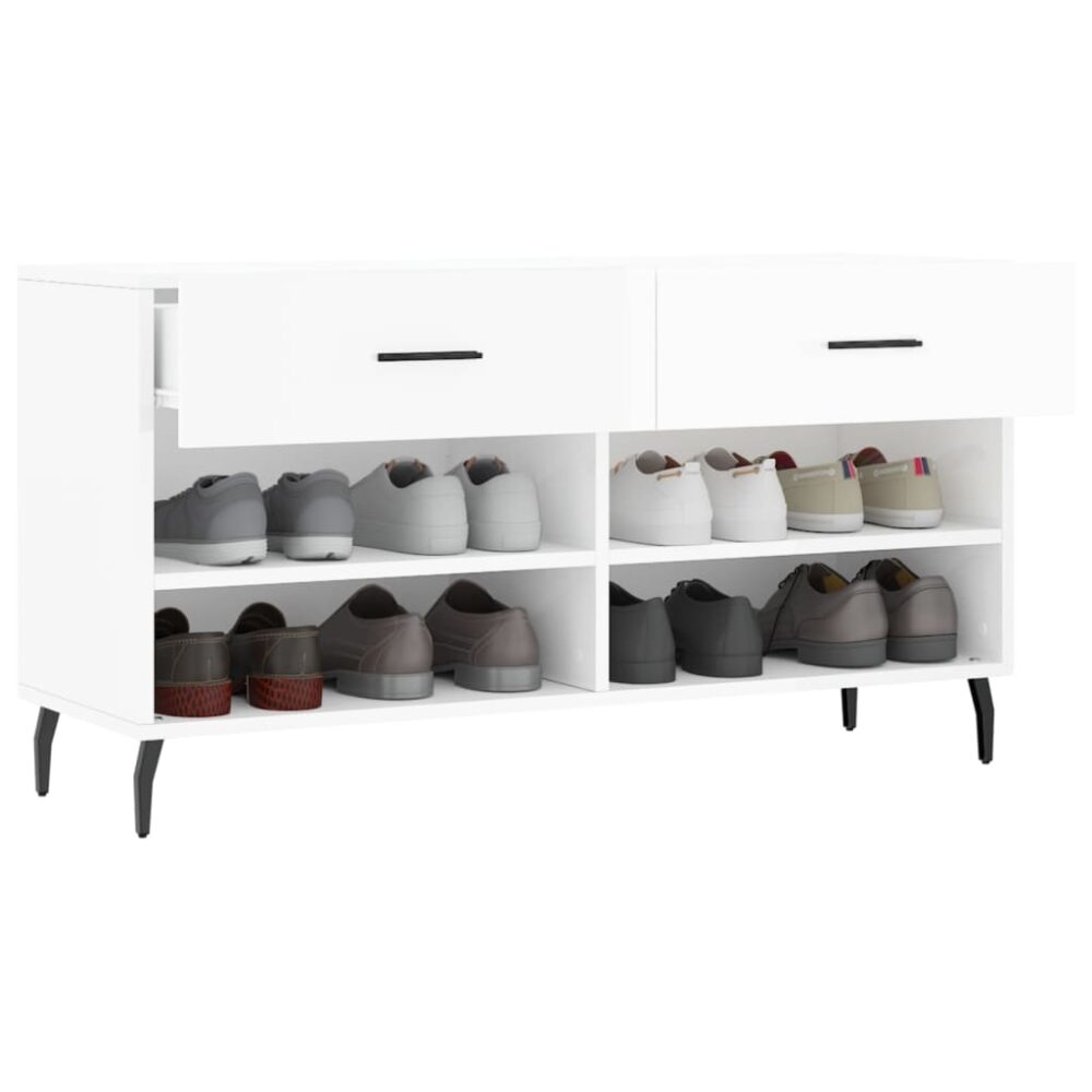 Arrume os seus sapatos com esta sapateira elegante e prática. É a escolha perfeita para manter os seus sapatos organizados. Material durável: os derivados de madeira possuem uma qualidade excecional e oferecem uma superfície suave bem como força, estabilidade e resistência à humidade.Amplo espaço de arrumação: a sapateira possui 2 gavetas e 4 prateleiras, proporcionando um amplo espaço para os seus sapatos e outros pequenos artigos.Tampo robusto: o tampo robusto da sapateira permite que se sente confortavelmente enquanto descalça ou calça os seus sapatos.Pés de ferro: os pés de ferro dão um toque industrial ao seu interior, enquanto asseguram estabilidade. Atenção:Para evitar que o produto se vire, deve utilizar o dispositivo de fixação na parede fornecido.