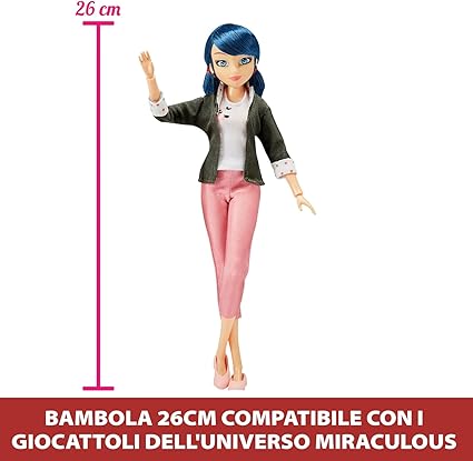 - A boneca de Marinette/Ladybug mede 26 cm e possui várias articulações, pode ser facilmente manuseada para recriar os seus momentos favoritos da série