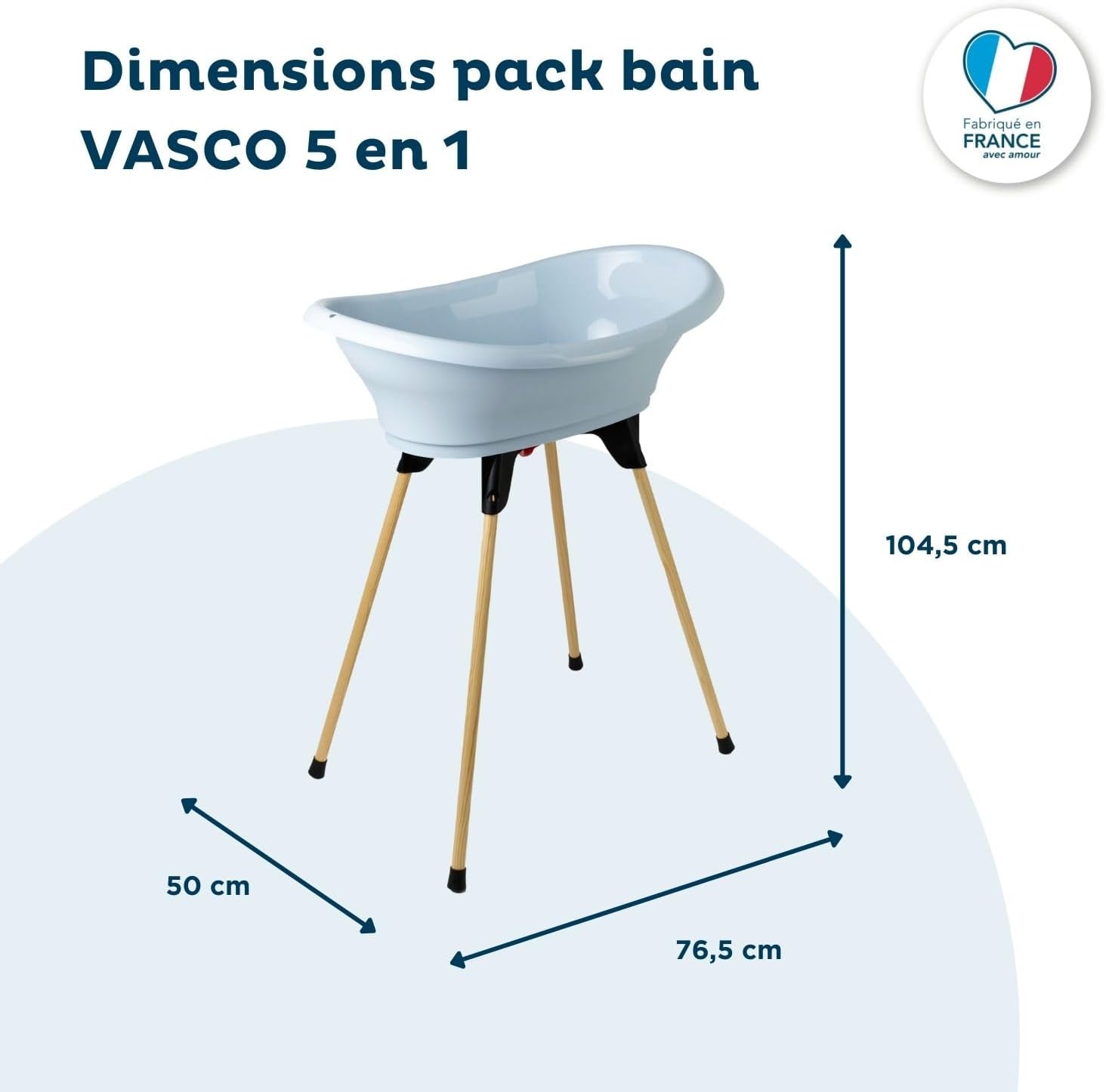 - Pacote de casa de banho completa: o pacote de banho para bebé VASCO 5 em 1 reúne todos os equipamentos essenciais para o banho de bebé. Inclui banheira, pé dobrável, mangueira de drenagem, espreguiçadeira de banho e termómetro.